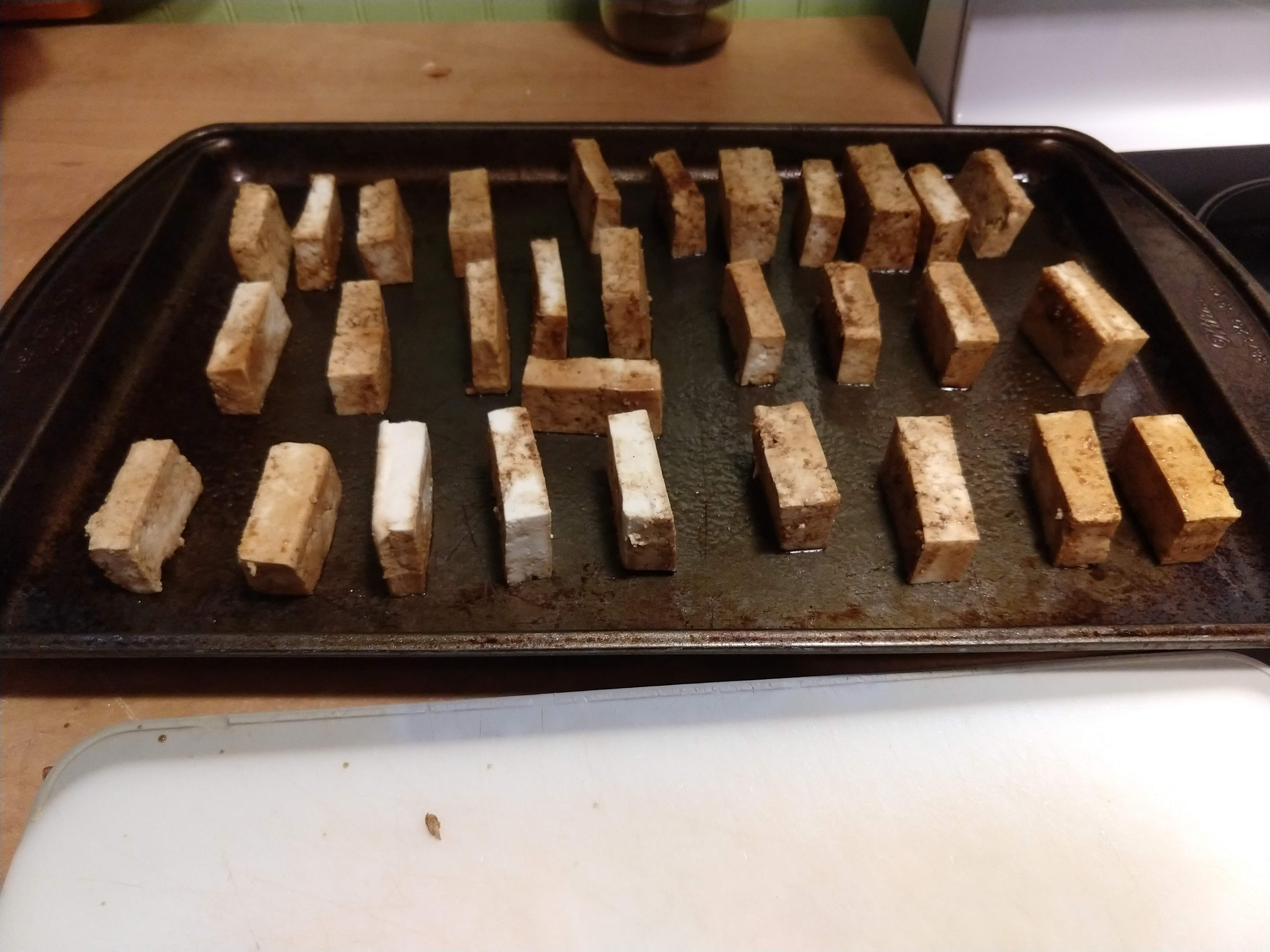 Lightly oil a baking tray. This is the one slightly tricky part- setting the marinated tofu blocks on a narrow edge. This exposes maximum surface area to the hot air in the oven. Put the tofu in the oven for 15 minutes, then check the texture. The outside should look dry and the edges should be browned. If the tofu is still too damp, give it another 5-10 minutes and check again.