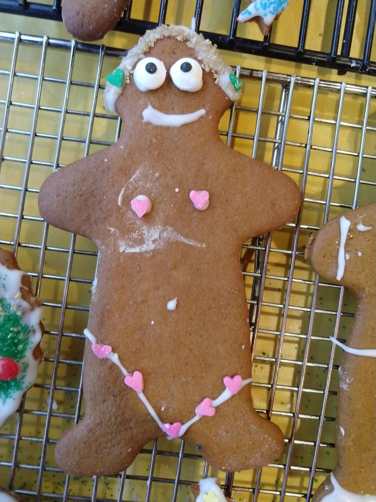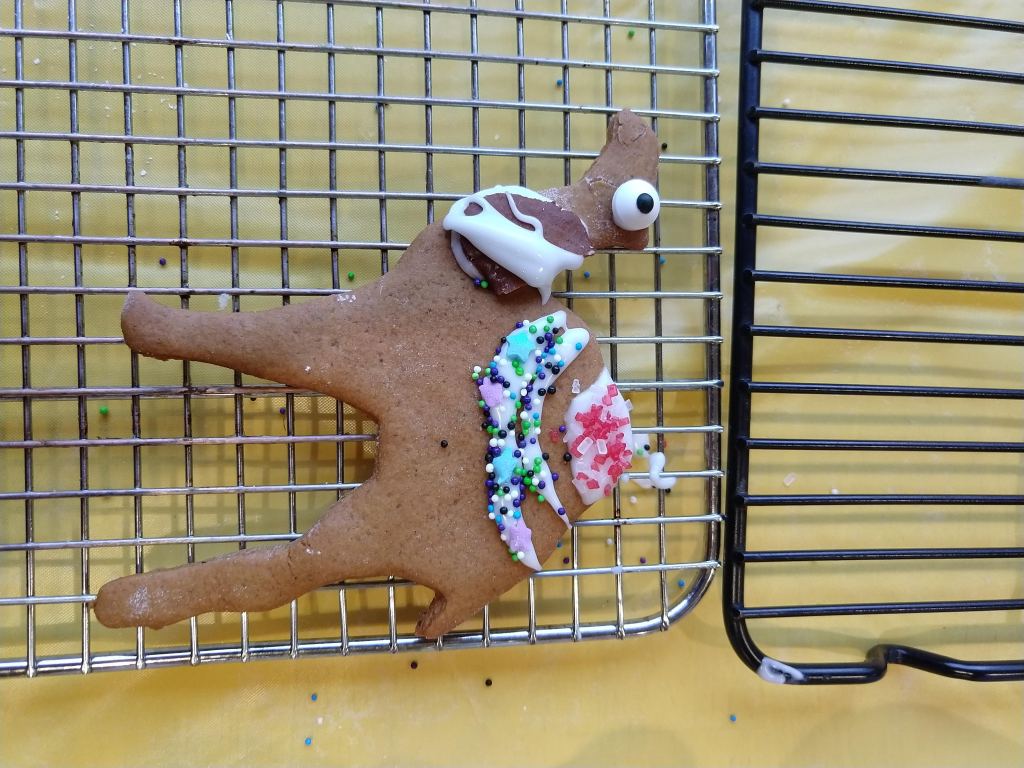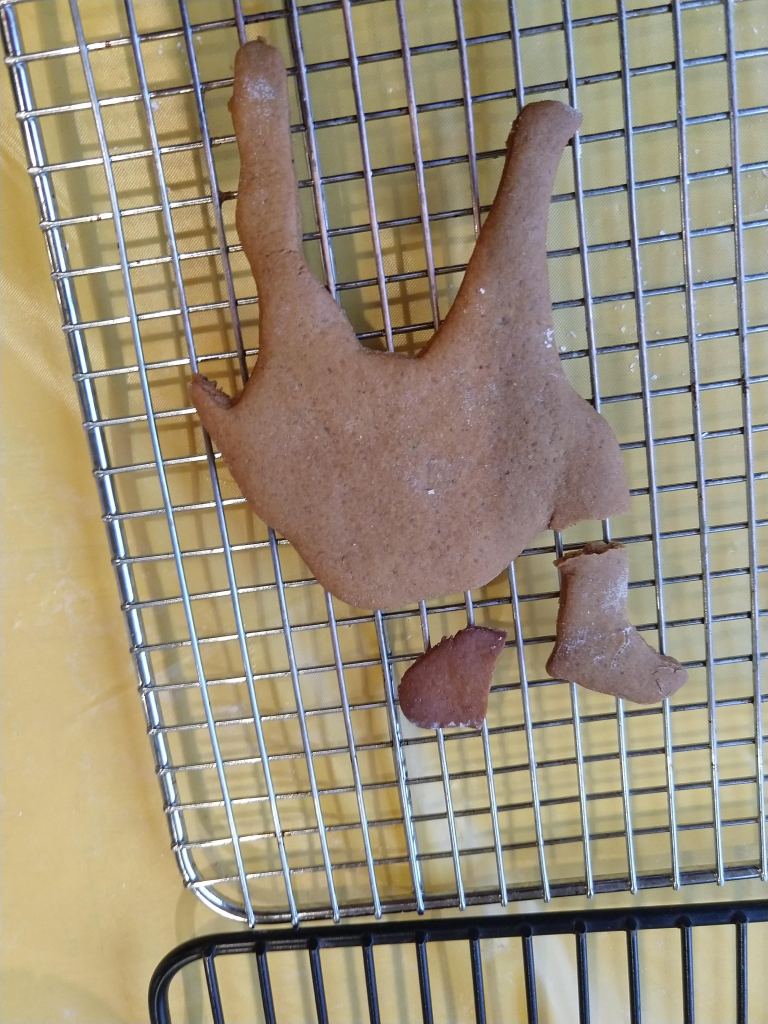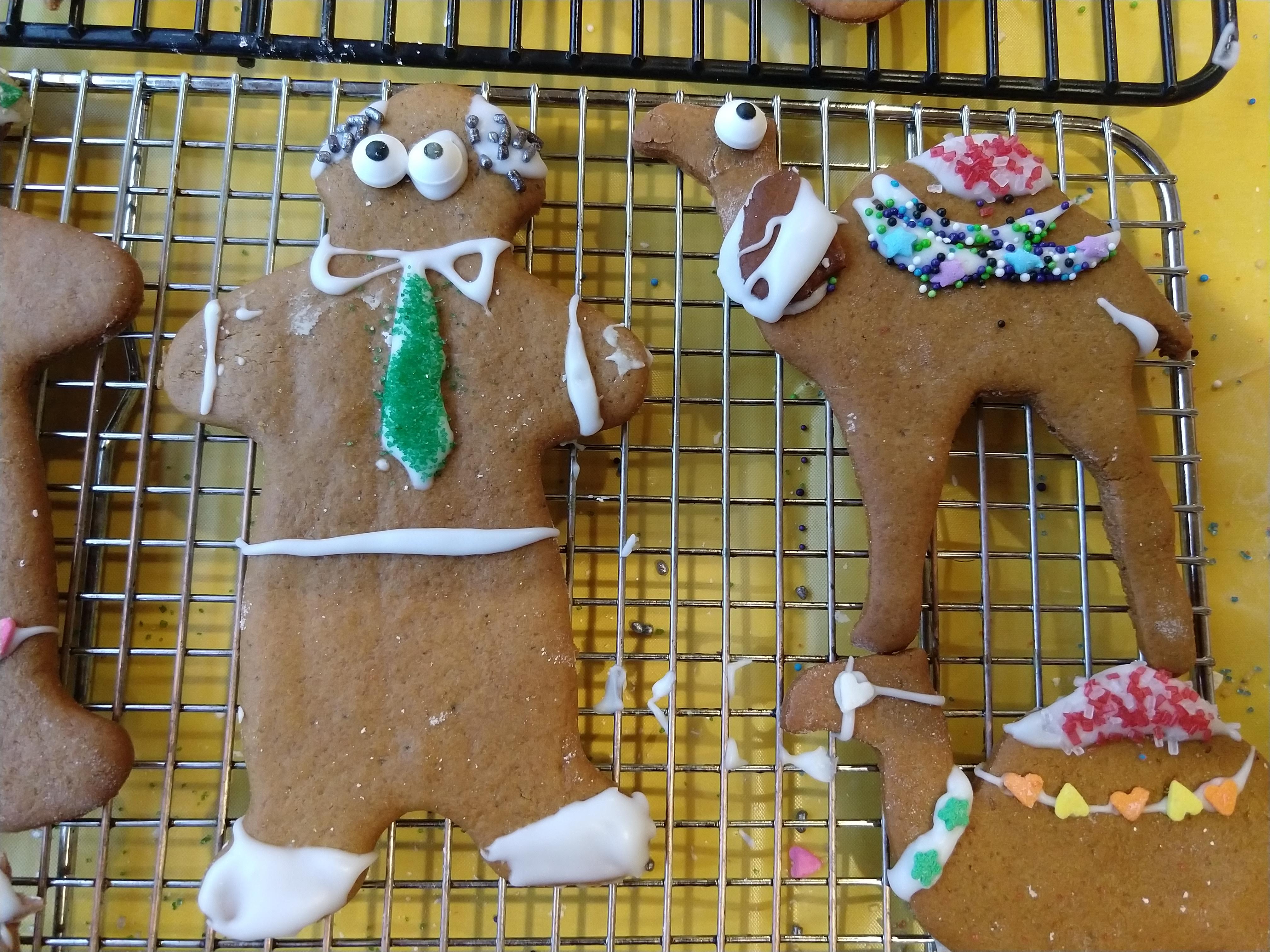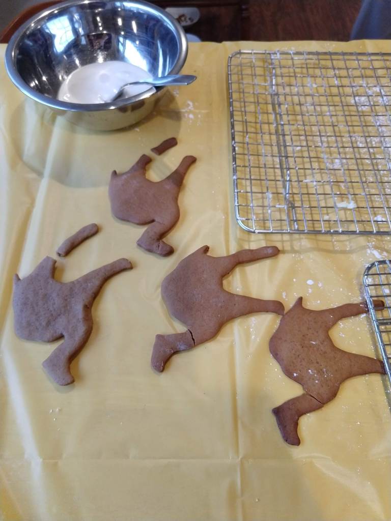 This year had an added twist. Moravian spice cookie dough is notoriously temperamental. Sometimes it is crumbly when we roll it out; sometimes it is sticky. There is no way to predict exactly how the dough will behave. This year the dough seemed well behaved during rolling and cutting, but the cookies were extra brittle when baked. As a result, we had more broken cookies than normal. The camel situation would make a veteran veterinarian sweat. Don’t get me started on the folk. We made it work, however. Just look!
