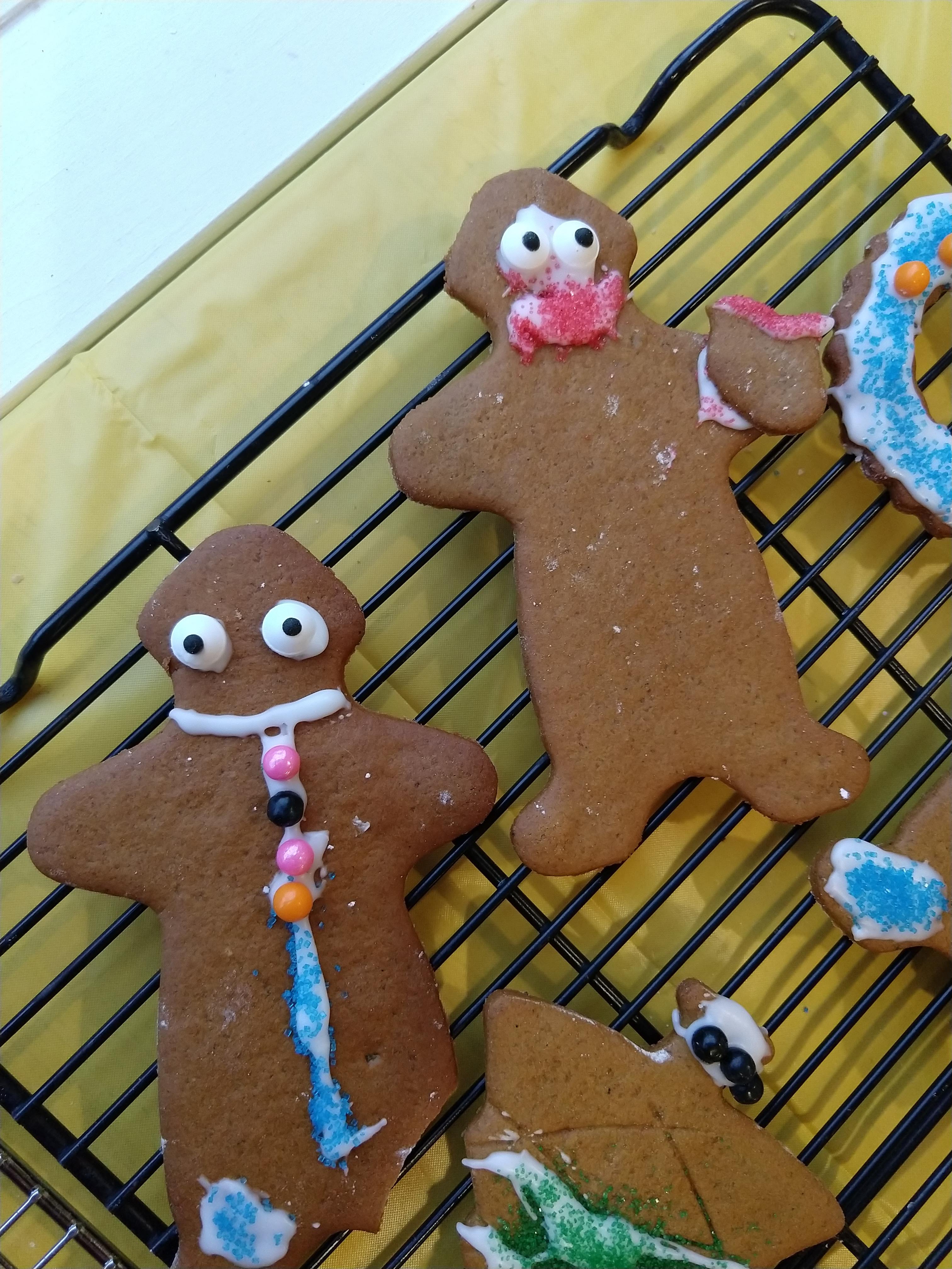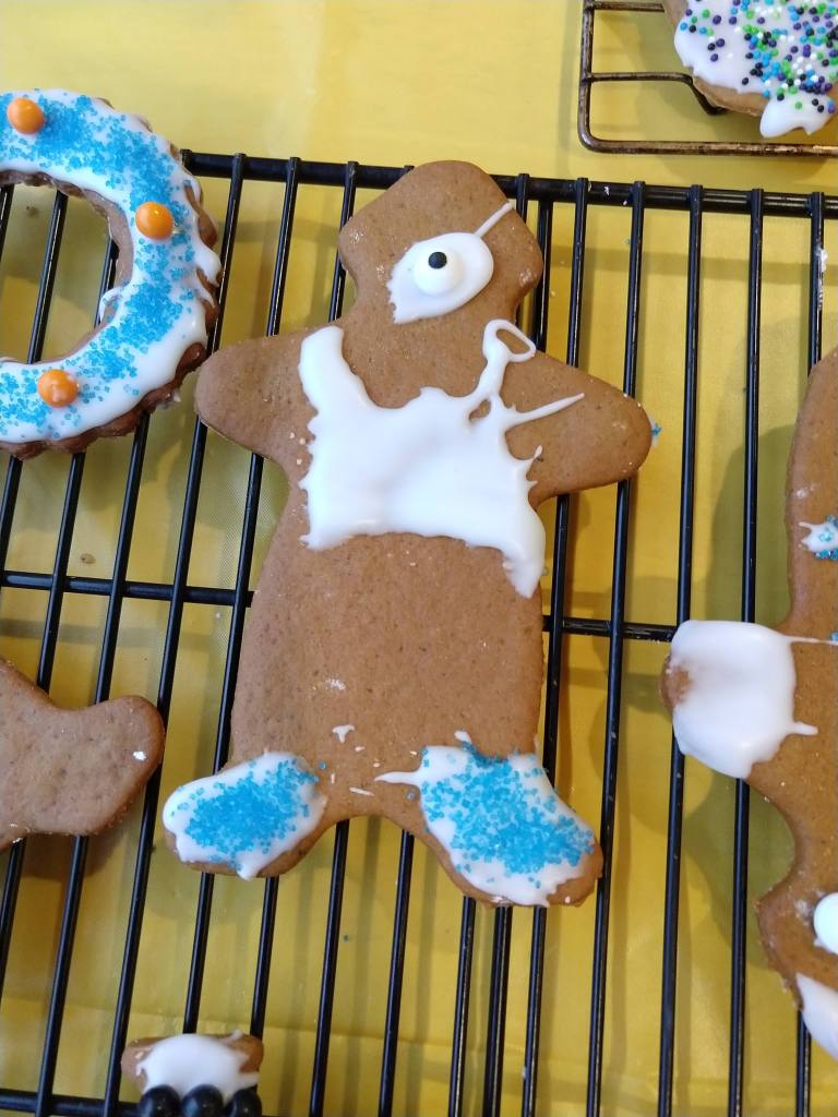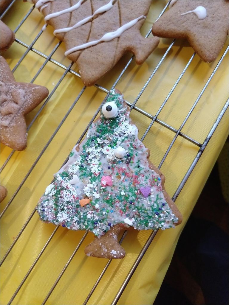 We had so much fun with the gingerbread folk that we forgot to save one to make a zombie. So, we made a zombie Christmas tree. (If you have not read my Cookie Day posts before, the zombie is just a cookie decorated with all the sprinkles that fell on the table.)