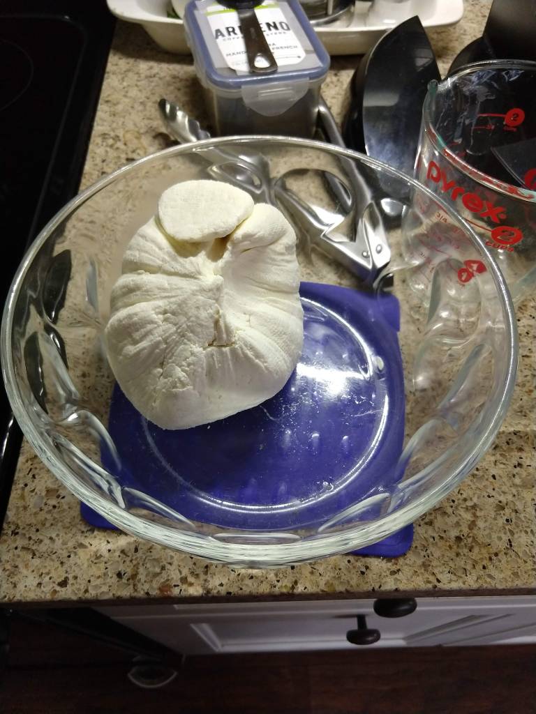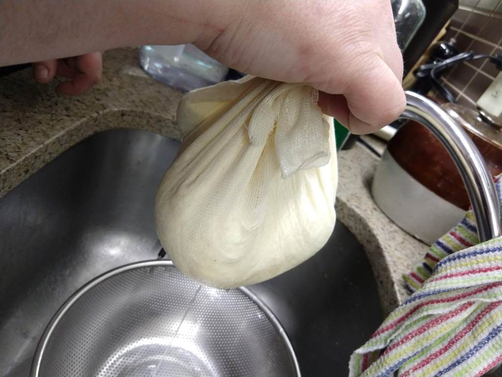 We used a cheese cloth for its indented purpose- separating the liquid whey from the cheese curds. After a good draining, we heated the curds in the microwave (yeah, the microwave) and started kneading them. It took four or five heat/knead cycles, so we all took turns. The curds were crumbly at first, but very suddenly, we had a smooth ball of cheese. We wrapped the warm cheese and left it to cool thoroughly in the refrigerator.