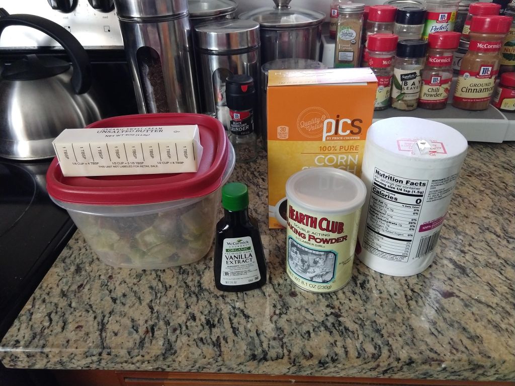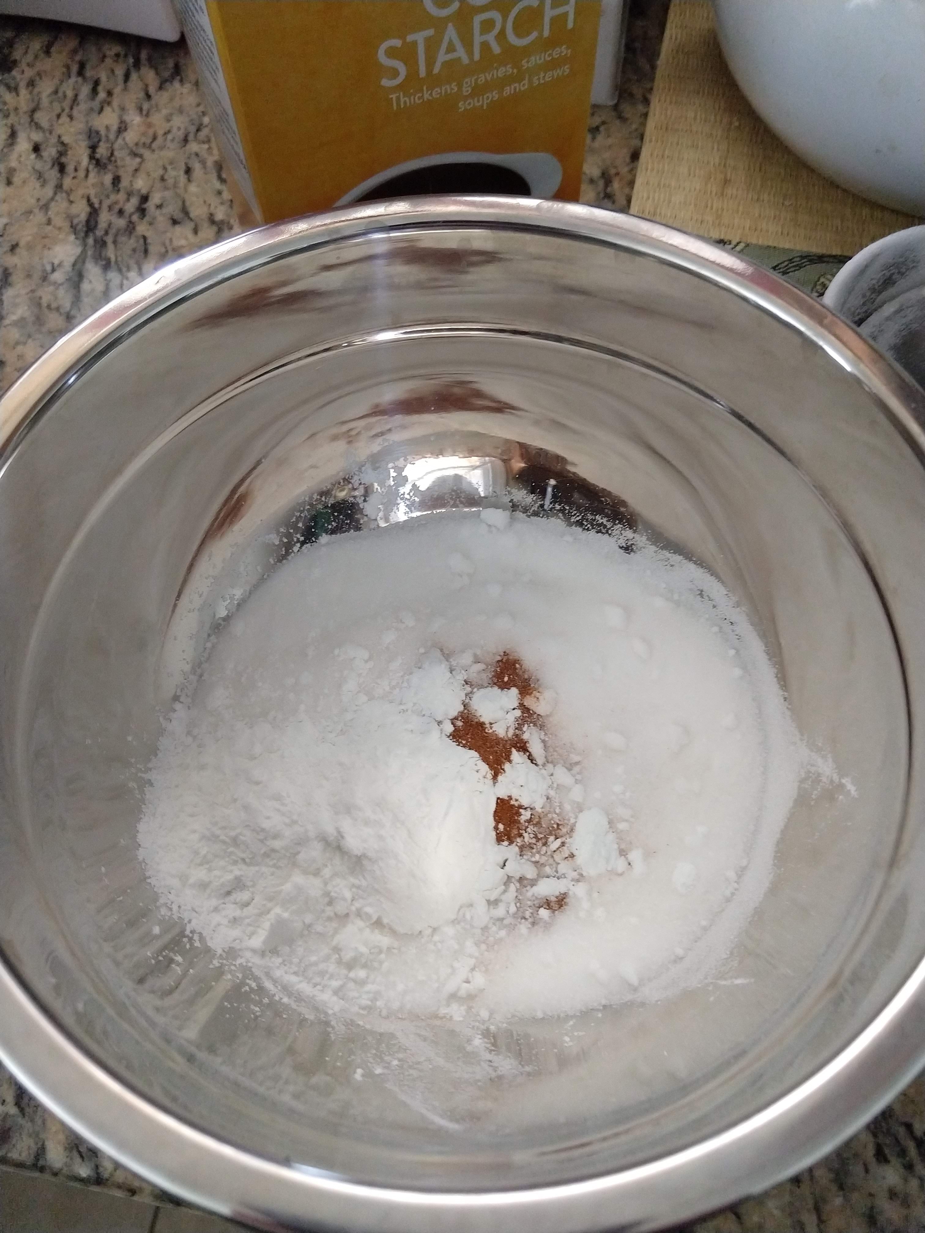 I managed to transfer the batter/dough to the pan. It took some effort to get it into an even layer. Full disclosure- I did resort to using my hands. Syllie then sprinkled the cinnamon-sugar-cornstarch topping over the batter. Finally, we came to the really, really strange step.