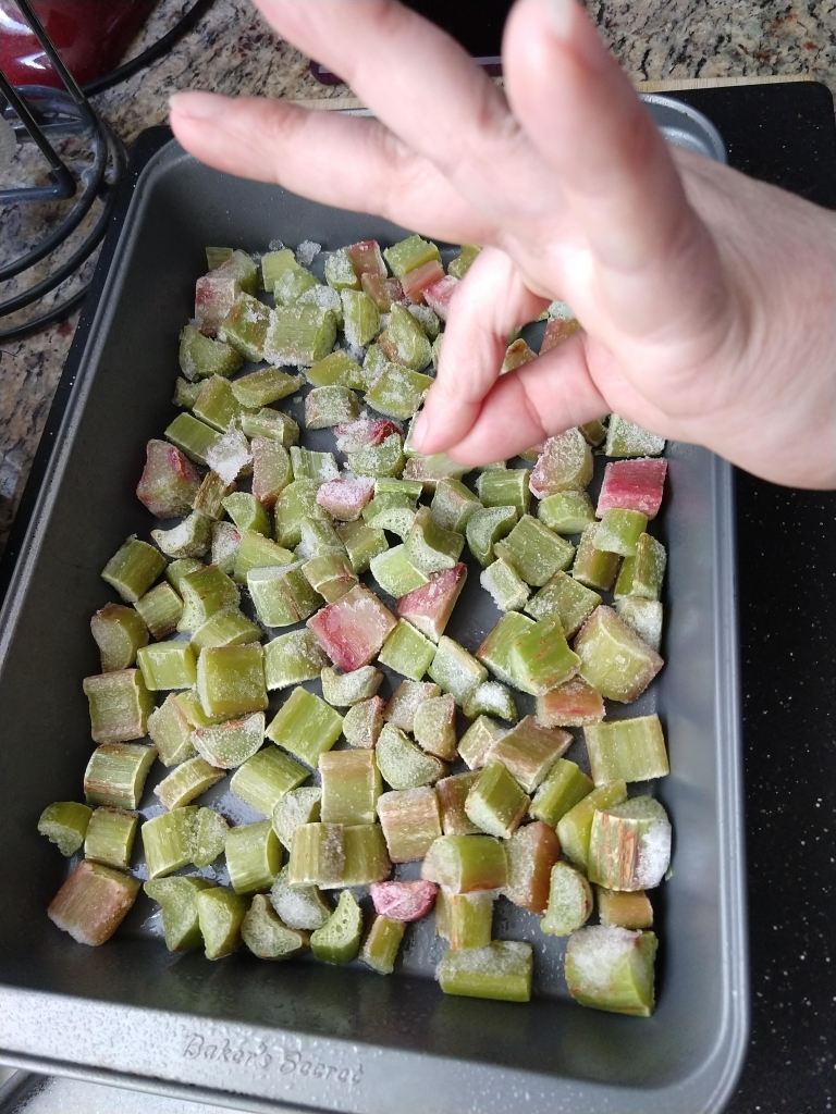 First we gathered our completely ordinary ingredients. Next, we dumped the still frozen rhubarb into the greased baking pan. Note Syllie removing a stringy bit from the pan. Here is where things got a little strange. No sugar was added to the rhubarb. If you have ever tasted fresh rhubarb you are probably just as suspicious as we were. We measured the dry ingredients, the wet ingredients, and the topping ingredients into separate bowls as the oven preheated.
