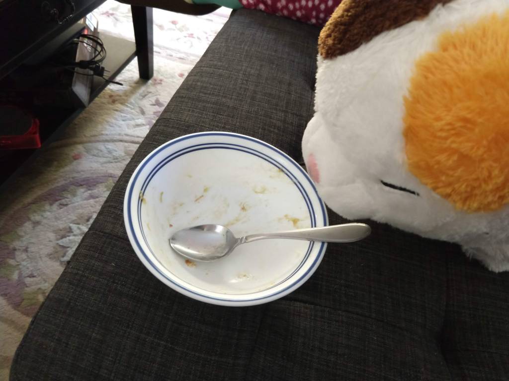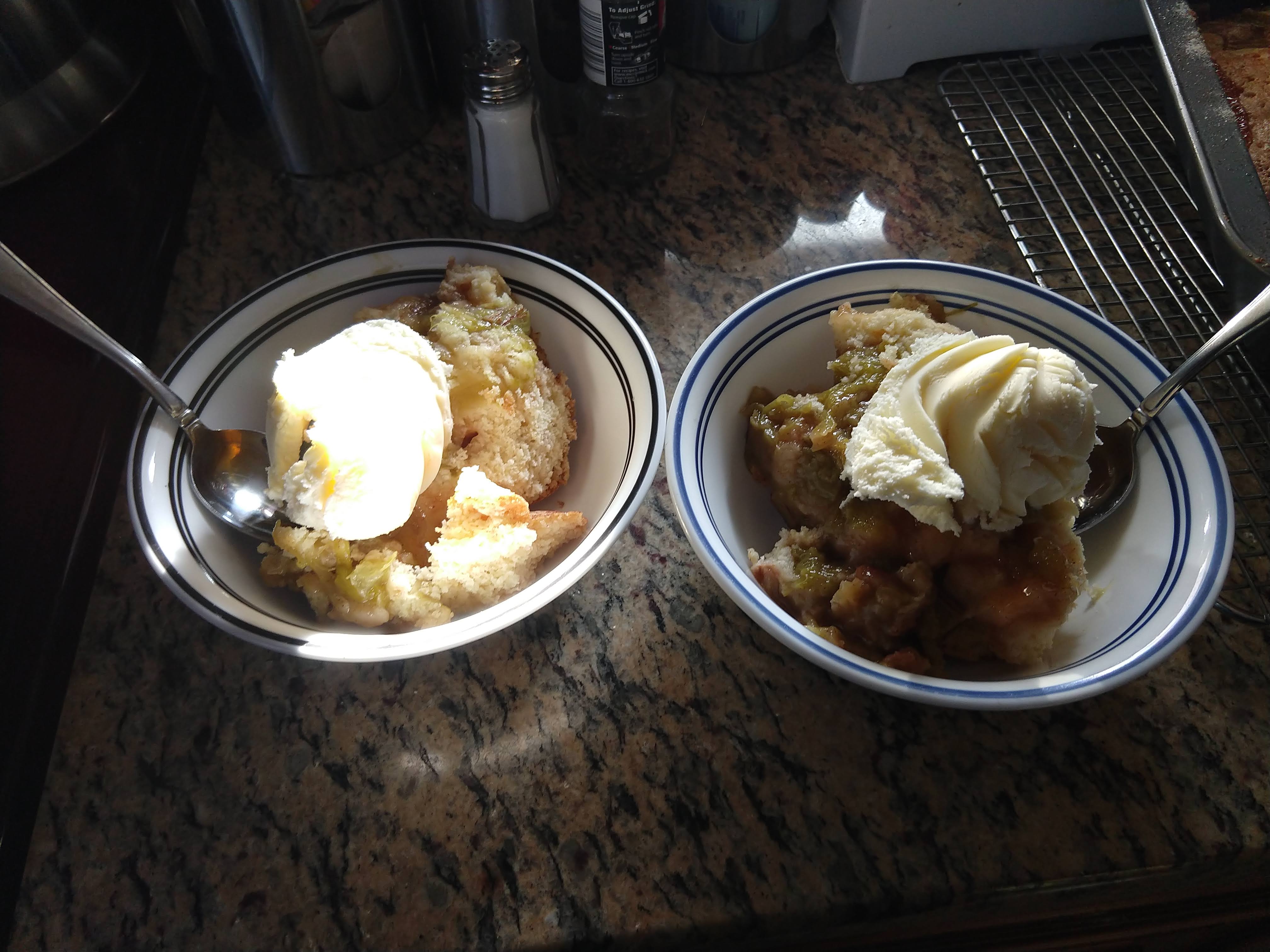 And an hour later a perfectly normal looking dessert emerged! The cinnamon-sugar-cornstarch mix had turned into a thin, crispy film over the cake. The rhubarb was cooked, but not mushy. Some of the sugar from the topping seemed to have been carried to the rhubarb by the boiling water, because it was just sweet enough. The cake was not dry. We enjoyed the cake with a little vanilla ice cream. I will definitely make this again.