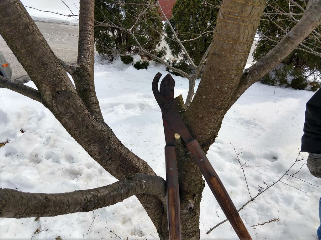 I learned that sour cherry varieties (such as the Montmorency’s we have) just need to be pruned for shape. We trimmed branches that crossed each other, down-growing branches, and branches growing towards the center of the overall shape of the tree. The aim is to encourage the branches into a “chalice” shape to maximize sunlight exposure and air flow. We decided to take out a few larger branches on each tree with a chain saw. I winced the whole time. I think the more open shape will help fend off the fungus we’ve had in the past few years, so I regret nothing.