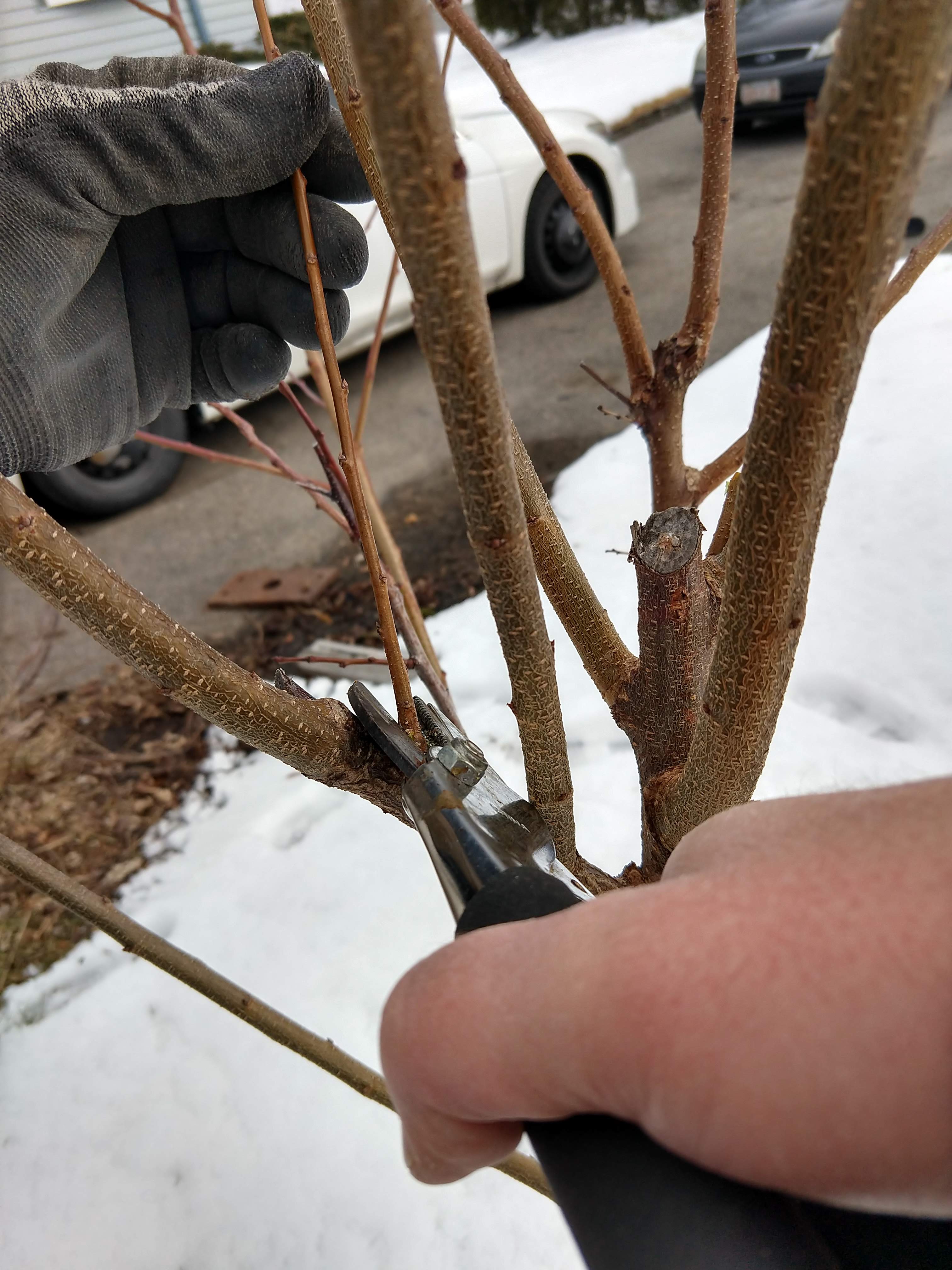 These aren’t the best pictures, but I was working barehanded in the cold, so I was trying not to stop (you can see dad’s gloved hand in the picture on the left). First, we trimmed away the the skinny twigs that will not be productive. Next, we found the “leader” on each graft, the central stem. We cut the leader just above a strong looking side branch. We trimmed the remaining side branches on each graft, leaving only two others. I think we did it right. At least, I do not think we permanently damaged the trees.