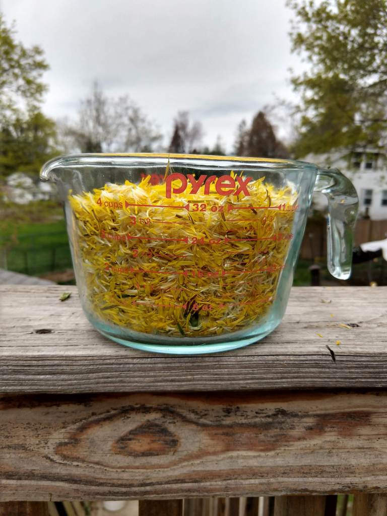 The next step is, according to some, optional. Rinse the petals. Why would that be optional? Some recipes insist that rinsing away the pollen defeats the whole purpose of dandelion syrup. I like rinsing plant parts before I prepare them for consumption. You do you, no judgment.