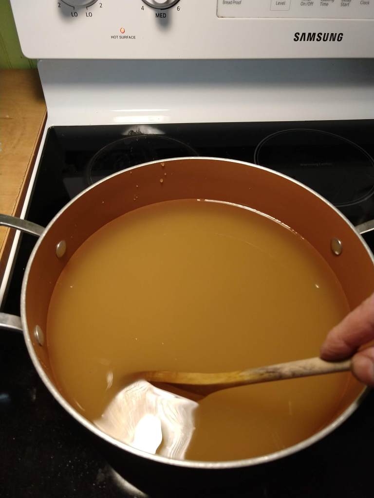 I decided I was done fooling around with boiling syrup after that. I let the pan cool a bit, cleaned off the stove top, and moved the dandelion syrup to jars. I used some to sweeten a pot of fresh mint and lemon balm tea. It really does taste like honey, although mine is a bit thinner than honey. If I feel motivated at a later date, I can always boil off more water. I want to try using this in ice cream, perhaps with some fresh dandelion petals.