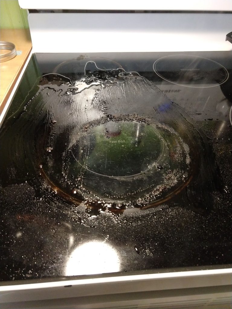 The next day I strained the dandelion infusion into my biggest measuring cup. I added one quarter cup of lemon juice. This brought my infusion volume to 6 cups. I moved the infusion to a wide sauce pan and added an equal volume (6 cups) of plain old white sugar. Then it was a gentle boil to cook the sugar and drive off some water. Warning to all my fellow DIYeters. Do not step away from your cooking sugar syrup. Bad things happen when syrup boils over. Observe: