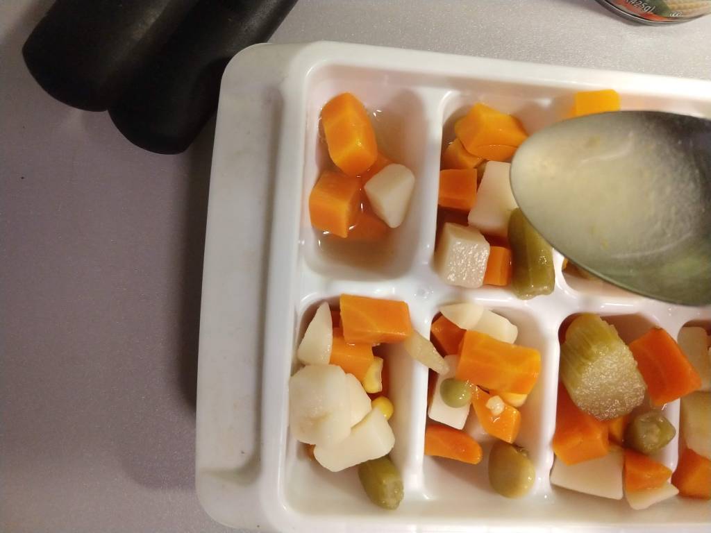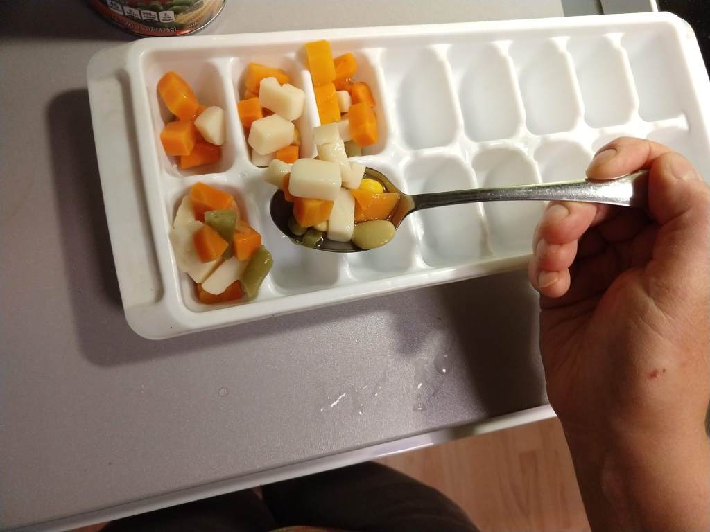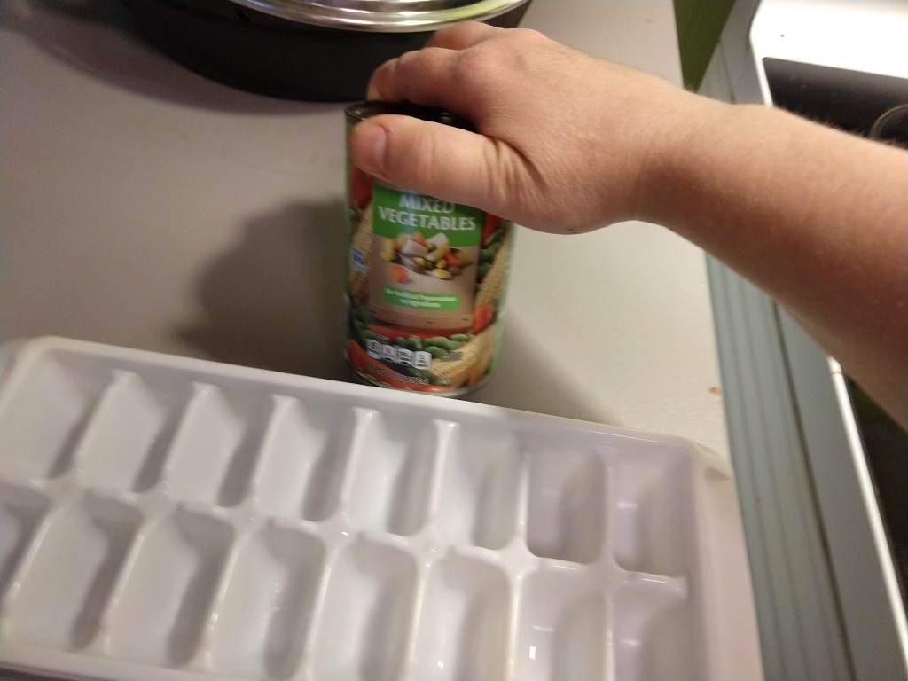I started Friday night, by making a frozen treat for the chickens. I spooned some canned mixed vegetables into an ice cube tray. I added the liquid from the can, and topped the cells off with extra water. I stashed the tray in the freezer. That is all it takes.