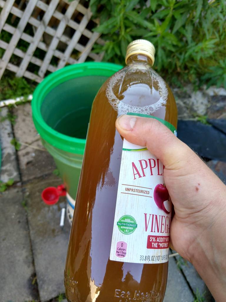 Saturday morning, while the temperature was more comfortable, I gave the chicken coop its not-less-than-weekly scrub. I let the ladies run around the yard while I did all this. I want them in the shade of the run during the heat of the day. Keeping the coop clean goes a long way to keeping the chickens, and your neighbors, comfortable. Dirty chicken litter breeds insects and smells terrible. I cleaned the roosting grates, and the water bucket. I spiked the filled bucket with a splash of apple cider vinegar. The vinegar keeps the water fresher.