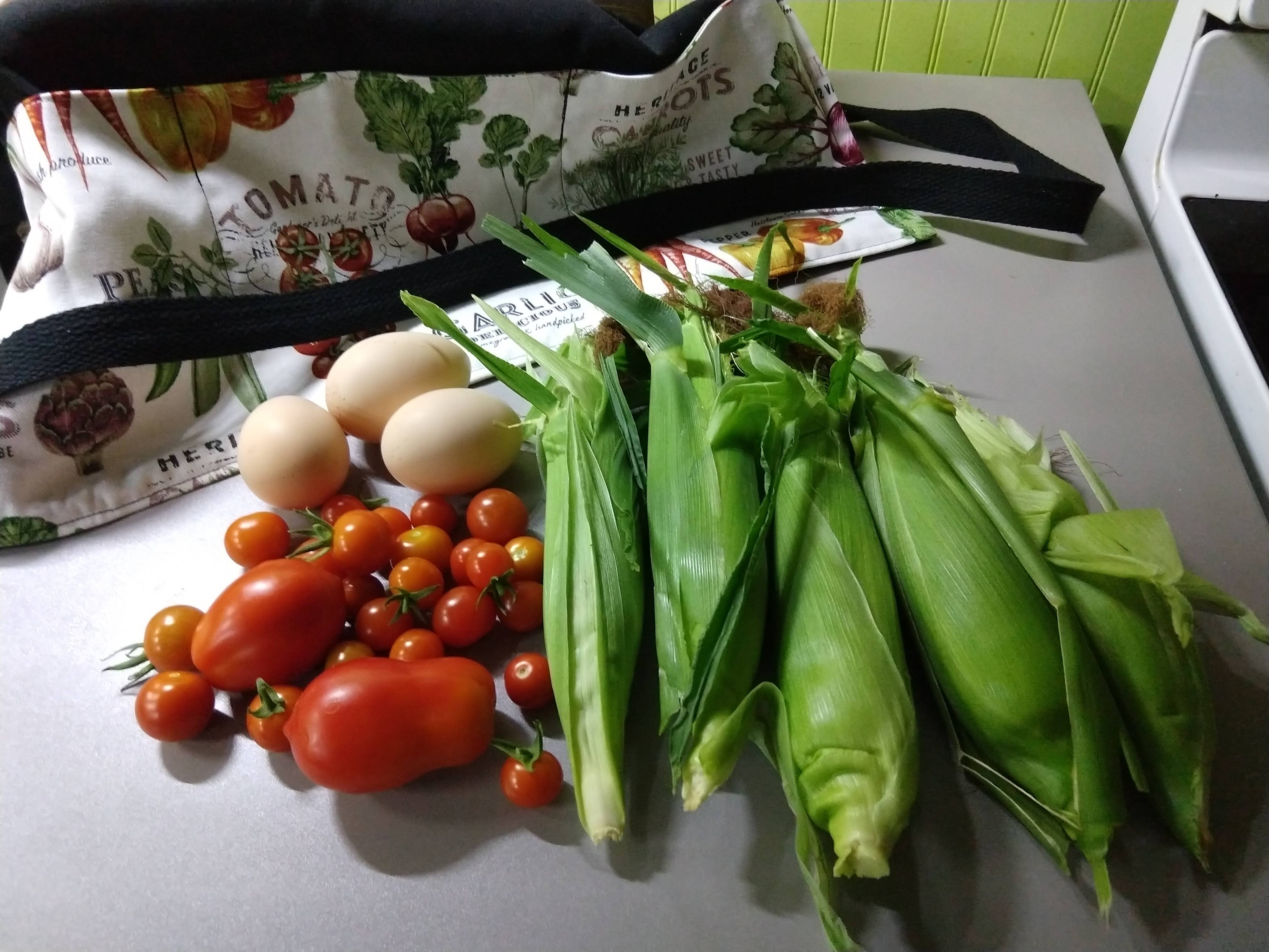 It is August and it is too hot and I am grumpy and my brain is not working efficiently. Thankfully, it is my second favorite season- tomato season! We got a couple ears of corn, as well. The hens are laying eggs like it is their job. Which it is, so that works out well.