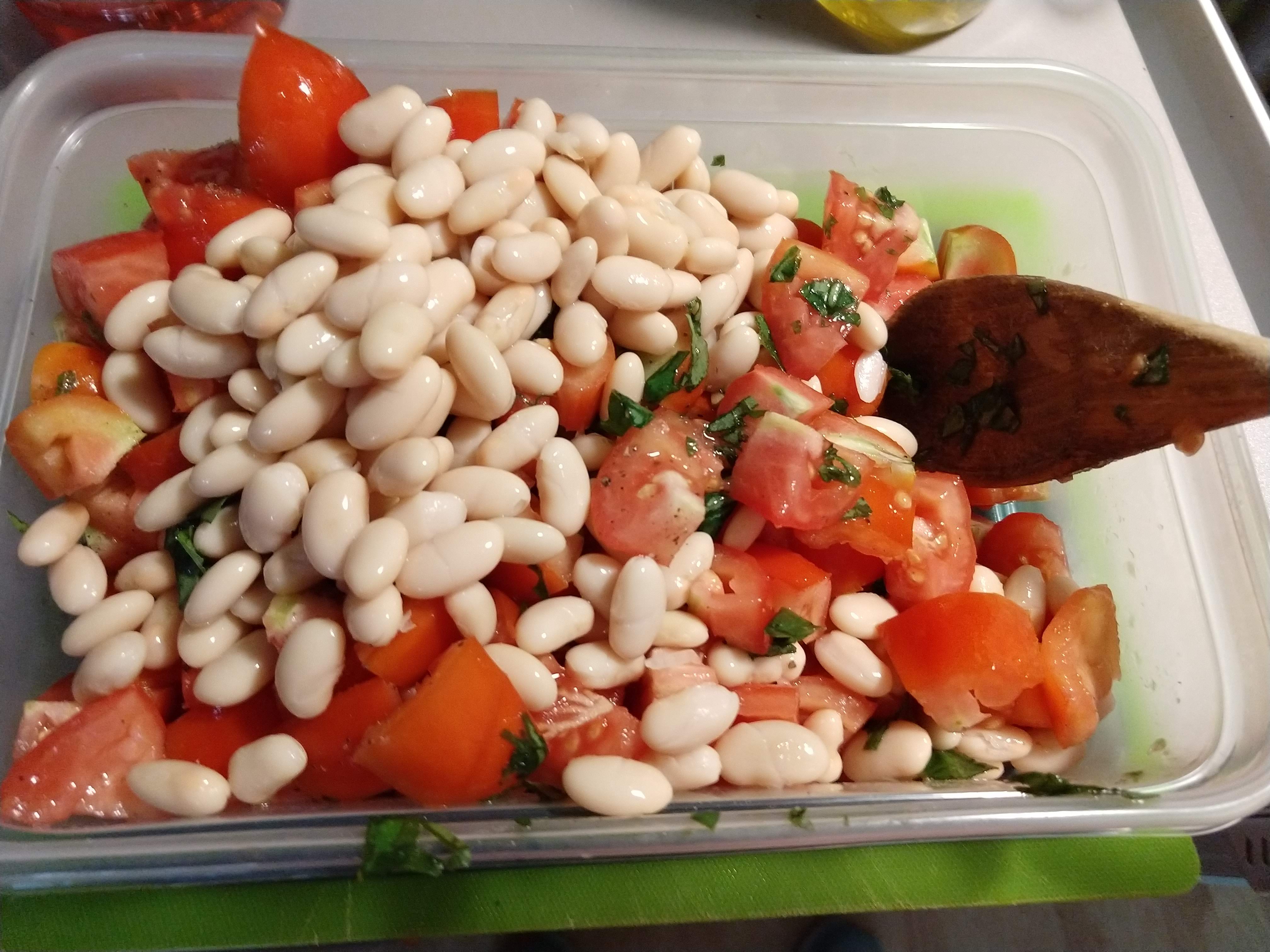 Chop some fresh basil and some tomatoes. Season to taste with salt, pepper, olive oil, and vinegar. For protein, and to make this dish more of a meal, add a 15 oz can of beans, drained and rinsed. I used cannellini beans, because that is what I had in the pantry. Chick peas would be good, too. Mix it all together and refrigerate until you feel hungry.