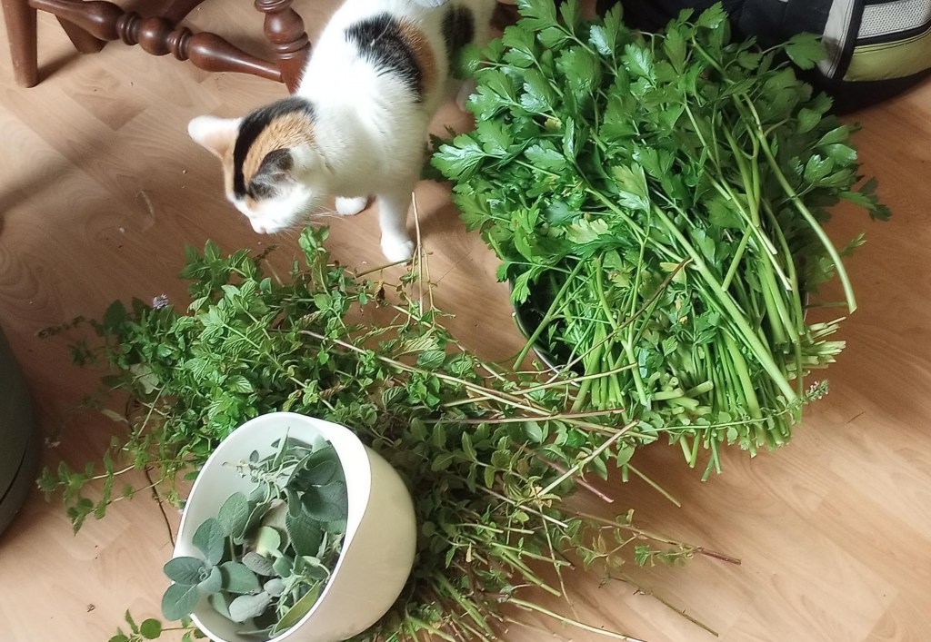 The herb garden was very happy in the spring. I grew edible chrysanthemums for the first time and found the flowers are a delicious addition to mint tea. Everything slowed down in the hot dry summer, and I had given up on having any significant harvest to dry and store for the winter. However, a mild and damp September and October revived the herbs just enough for a good crop. As you can see, D0ttMatrix approves of this herb harvest. All that sage, mint, and parsley is currently hanging up to dry in our cellar.
