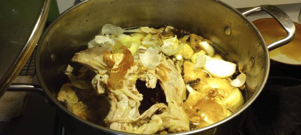 We celebrated Thanksgiving Day in the USA on November 24th. Although this has been a challenging year on many levels, we have plenty to be thankful for. We enjoyed the day with family, a roasted turkey, and pie. After the leftover light and dark meat were shared out, we were left with with a meaty turkey carcass, perfect for making broth. What better way to express gratitude for our food than to reduce food waste to the absolute minimum? If you have never made broth from scratch before, it is easy to do. All it takes is a big pot, some aromatic vegetables, and time.