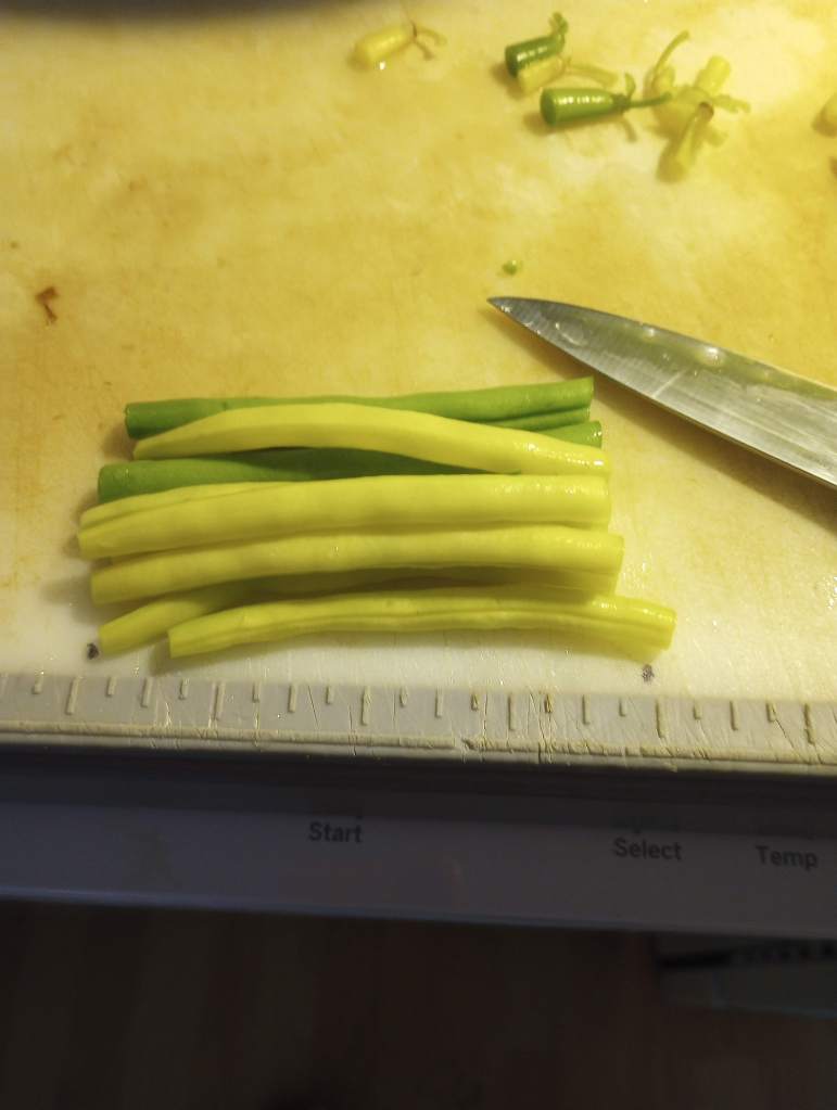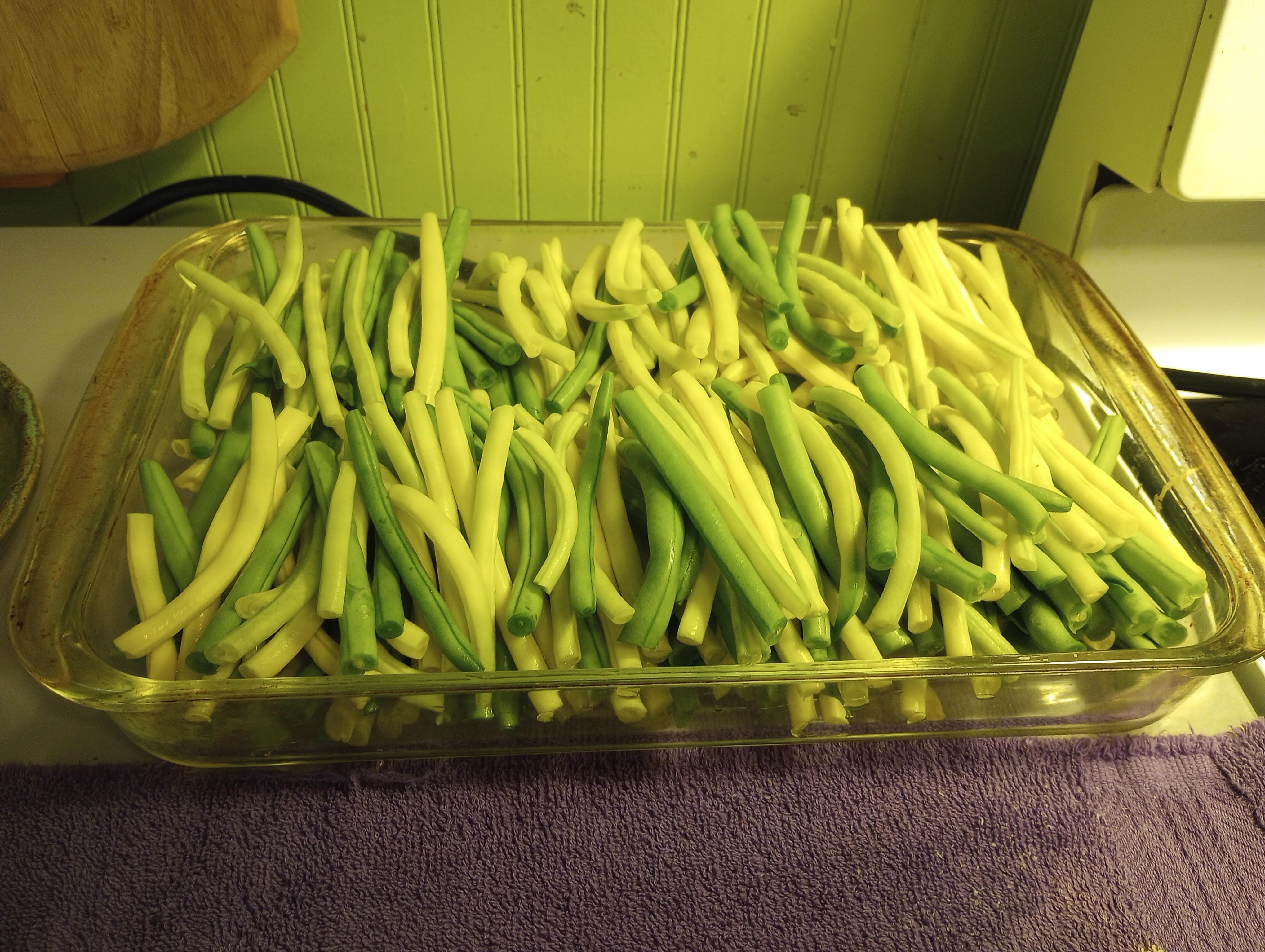 Next, I had to trim the beans. I have a cutting board with a ruler running down the side. If you do not have such a cutting board, all you need is one jar and a marker. Make two dots on the edge of the cutting board, one at the bottom of the jar and one near the top. The recipe says the jars need one-half inch of headspace, so I want my beans to sit a little lower than one-half inch from the rim of the jar. Look how easy it is to get neat, even beans! I also found that a baking dish helps keep the beans lined up for easy filling of the jars.
