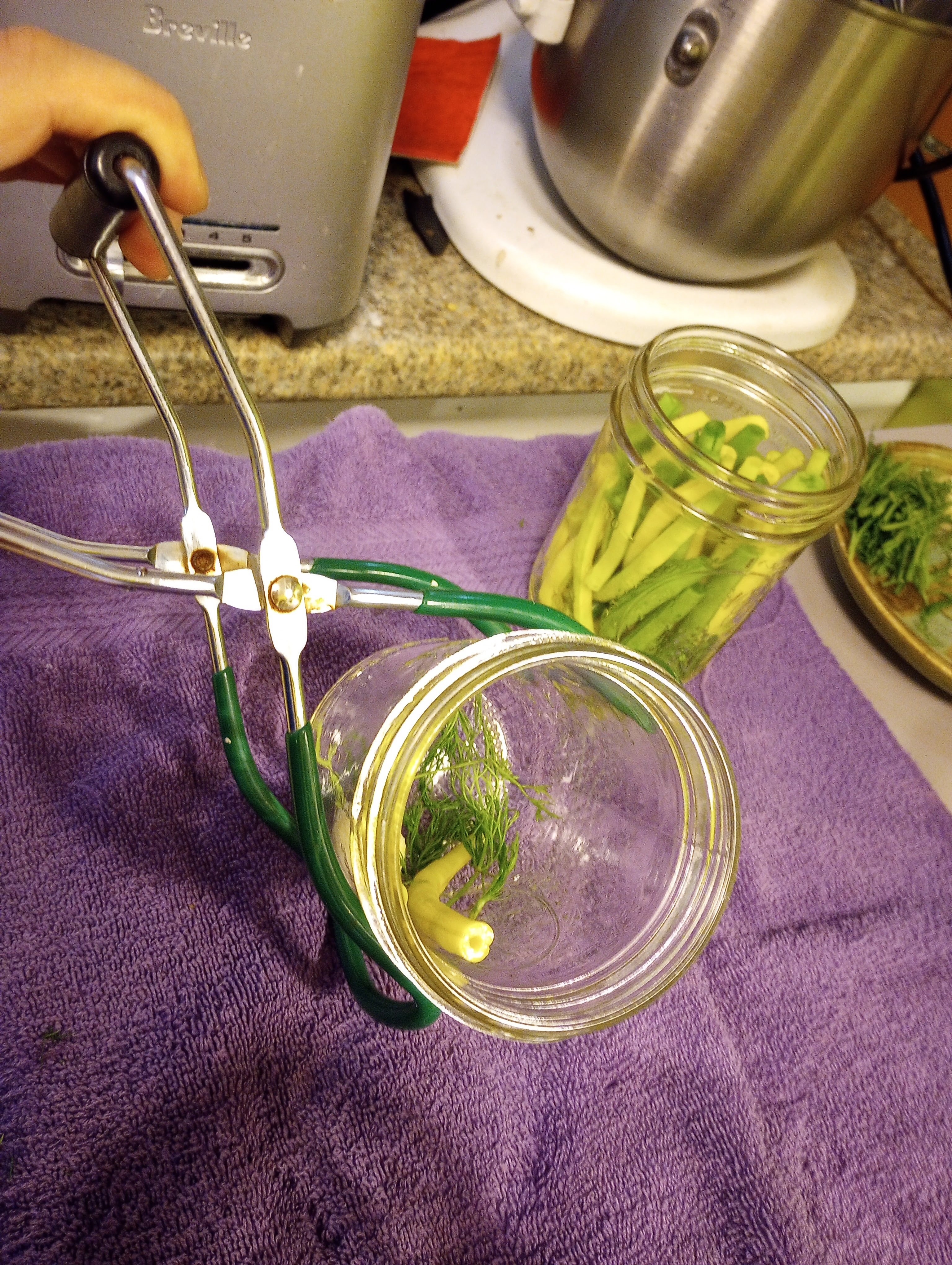 Once my brine was boiling and my jars were scalded, It was time to fill. I put a garlic clove and a dill sprig in the bottom of each jar. I found the jar lifter made it easy to hold the hot jars sideways for filling. Then I ladled in my brine, cleaned the rims, capped the jars and sent them for a 5 minute process, as directed in the recipe. You may notice only four jars in the photos. My kettle can’t hold eight wide-mouth pints with adequate space for water circulation. I took out the first four jars, filled them, took out the second four jars, put the four full jars into the kettle for processing, and filled the second group of four jars while the first four processed. This keeps the jars hot and allows the water to circulate.
