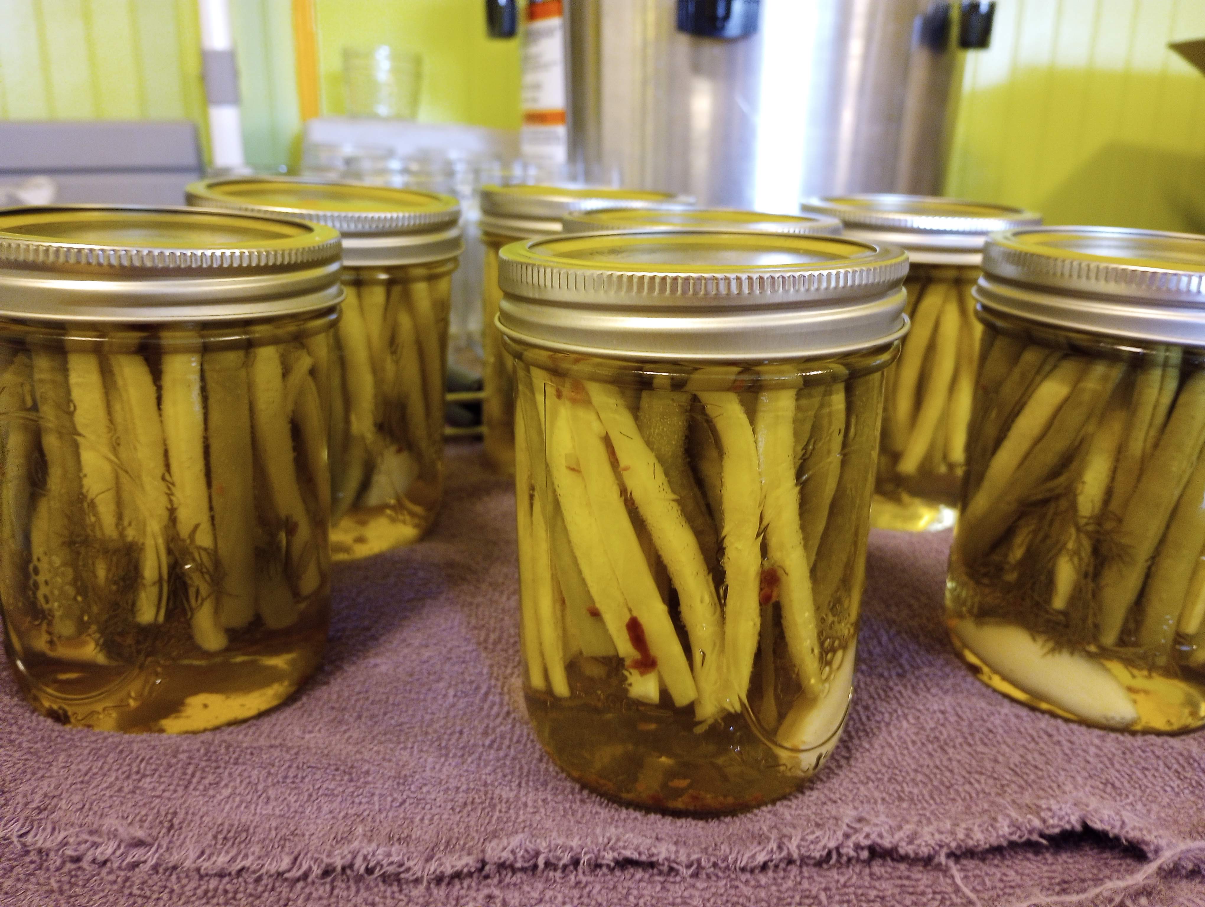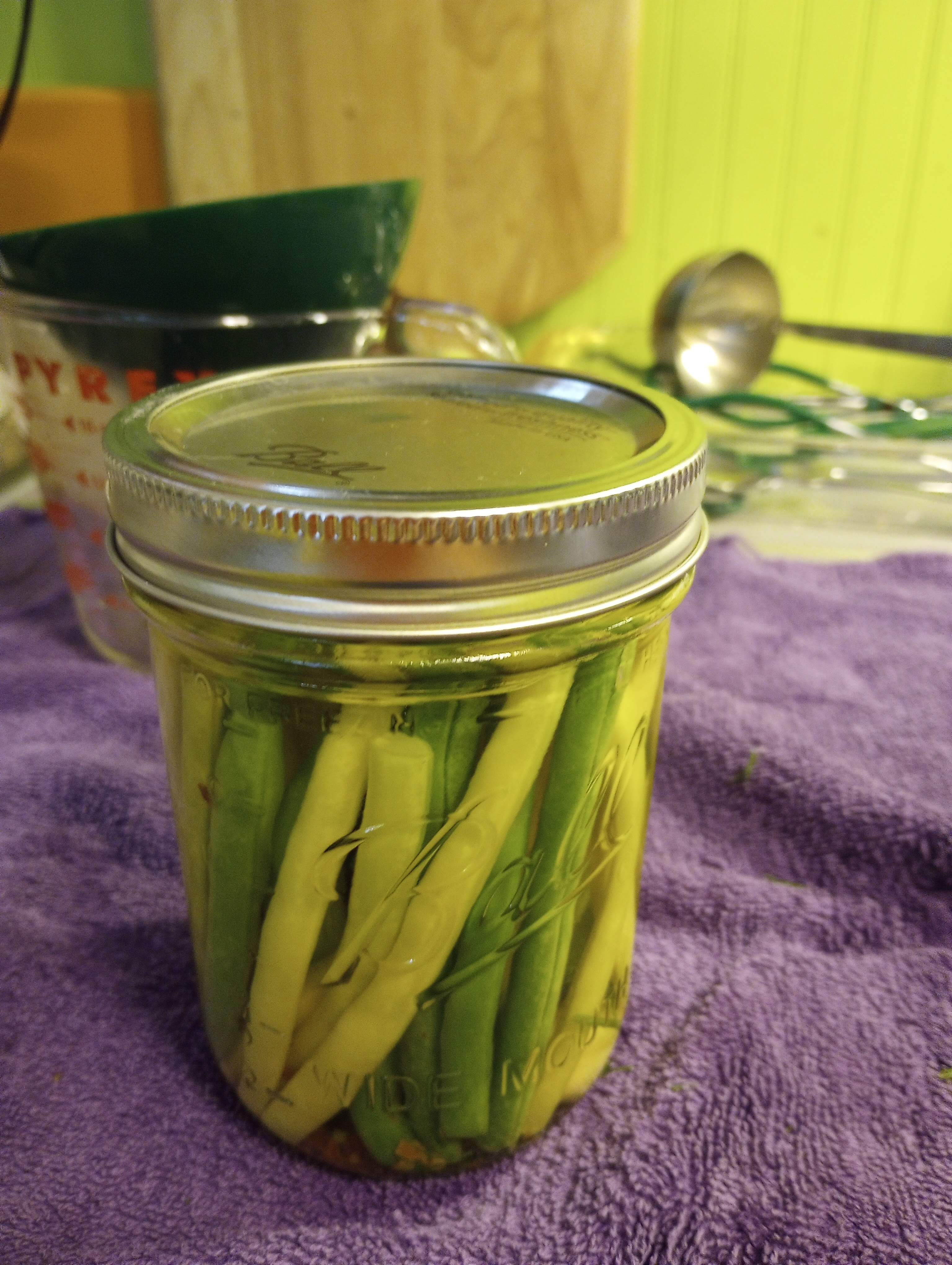 All seven of the jars I processed remained sealed after cooling for 24 hours. There was not quite enough brine for the eighth jar, so I mixed a 50/50 water/vinegar solution to top it off and that jar is now “refrigerator pickles”. I tried a couple of those today, and they are delicious! I have yet to ask Mr. Food It Yourself to try them, but I think he will enjoy the tart, salty, slightly hot (I added the optional red pepper flakes) beans.