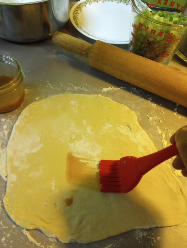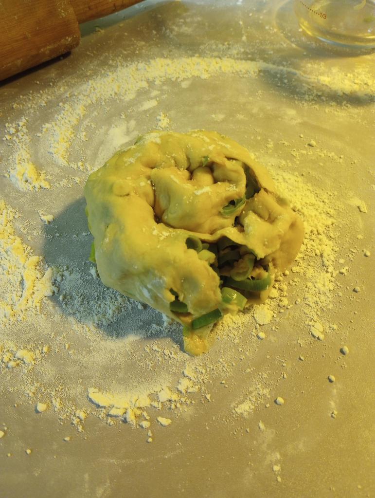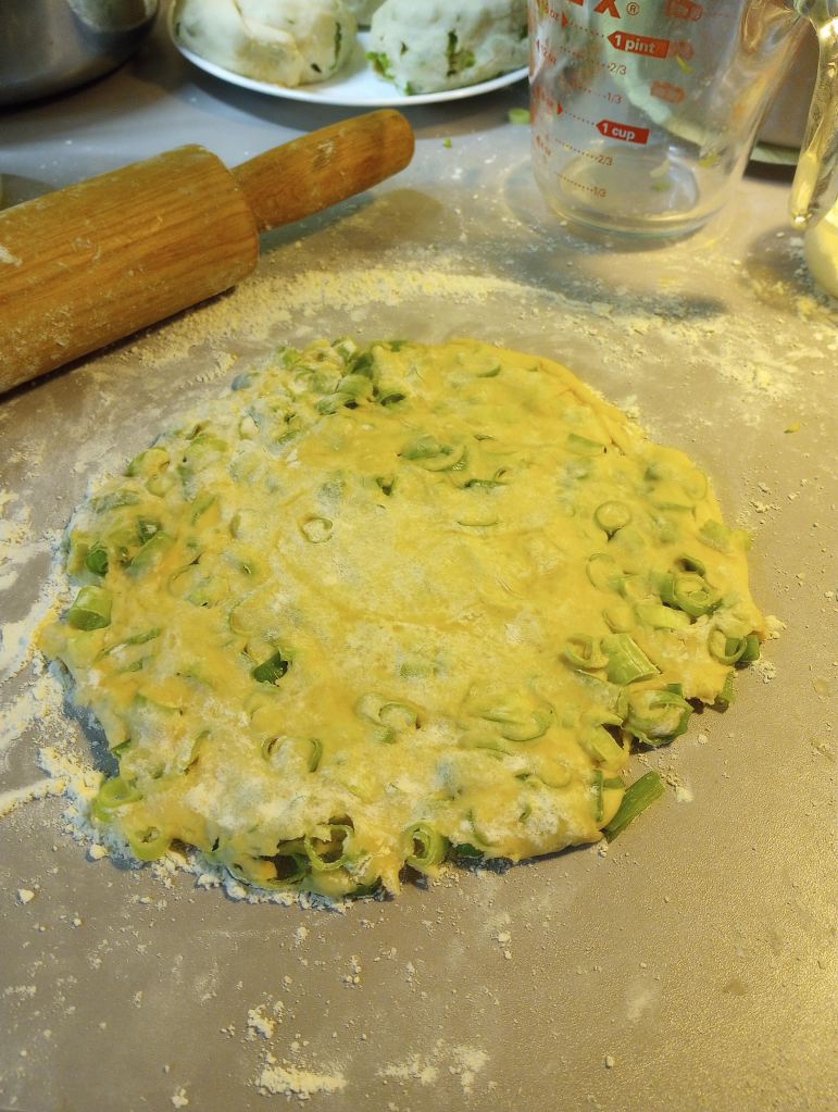 Mr. Food It Yourself is already quite skillful with a wok. I, however, do not have much skill in Asian cooking techniques. I do like pancakes, however, so I decided to try Mr. Lopez Alt’s recipe for Chinese- style scallion pancakes. The recipe uses a very interesting technique. A watery dough is rolled with an oil mixture. Since oil and water are famous for not mixing, the re-flattened dough develops the signature flakey texture scallion pancakes are known for.