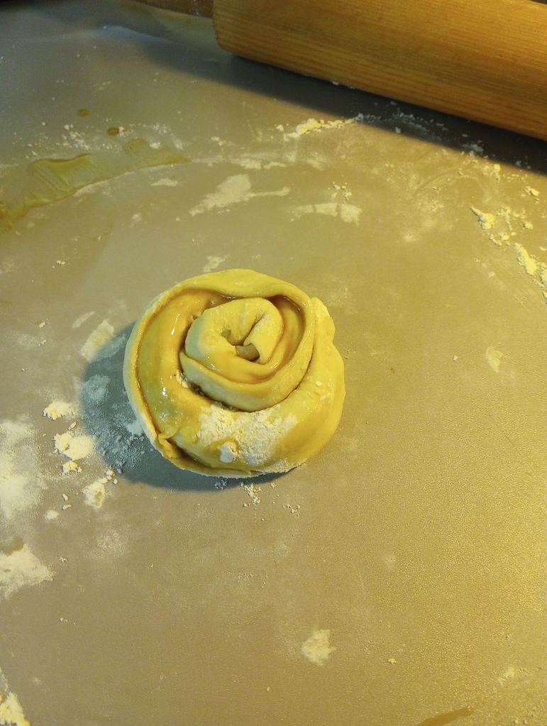Get your skillet hot over medium heat. While that is happening, roll one quarter of the dough flat and brush it with a thin layer of oil/four mixture. Roll the dough into a log, then curl the roll into a circle, like a cinnamon bun. This creates the flake-inducing water and oil layers. Roll and oil the dough once more, and top with one fourth of the sliced scallions. Then, repeat the roll-and-curl. My first one was a little rough looking until the final roll out. Fry the pancakes one at a time until both sides are browned, 3-5 minutes on a side seems to work with my pan and my stovetop. The recipe says to put about a tablespoon of oil in the pan for each pancake, but I found mine cooked better with just a mist of pan spray.