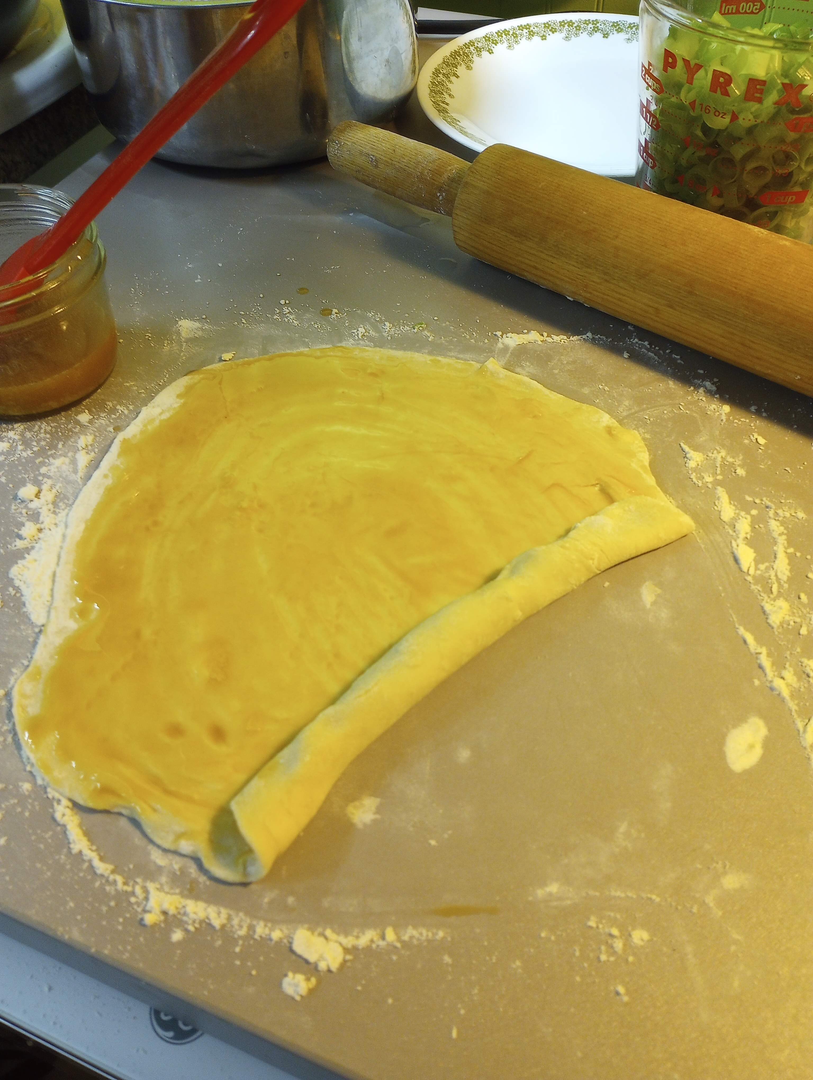 Get your skillet hot over medium heat. While that is happening, roll one quarter of the dough flat and brush it with a thin layer of oil/four mixture. Roll the dough into a log, then curl the roll into a circle, like a cinnamon bun. This creates the flake-inducing water and oil layers. Roll and oil the dough once more, and top with one fourth of the sliced scallions. Then, repeat the roll-and-curl. My first one was a little rough looking until the final roll out. Fry the pancakes one at a time until both sides are browned, 3-5 minutes on a side seems to work with my pan and my stovetop. The recipe says to put about a tablespoon of oil in the pan for each pancake, but I found mine cooked better with just a mist of pan spray.