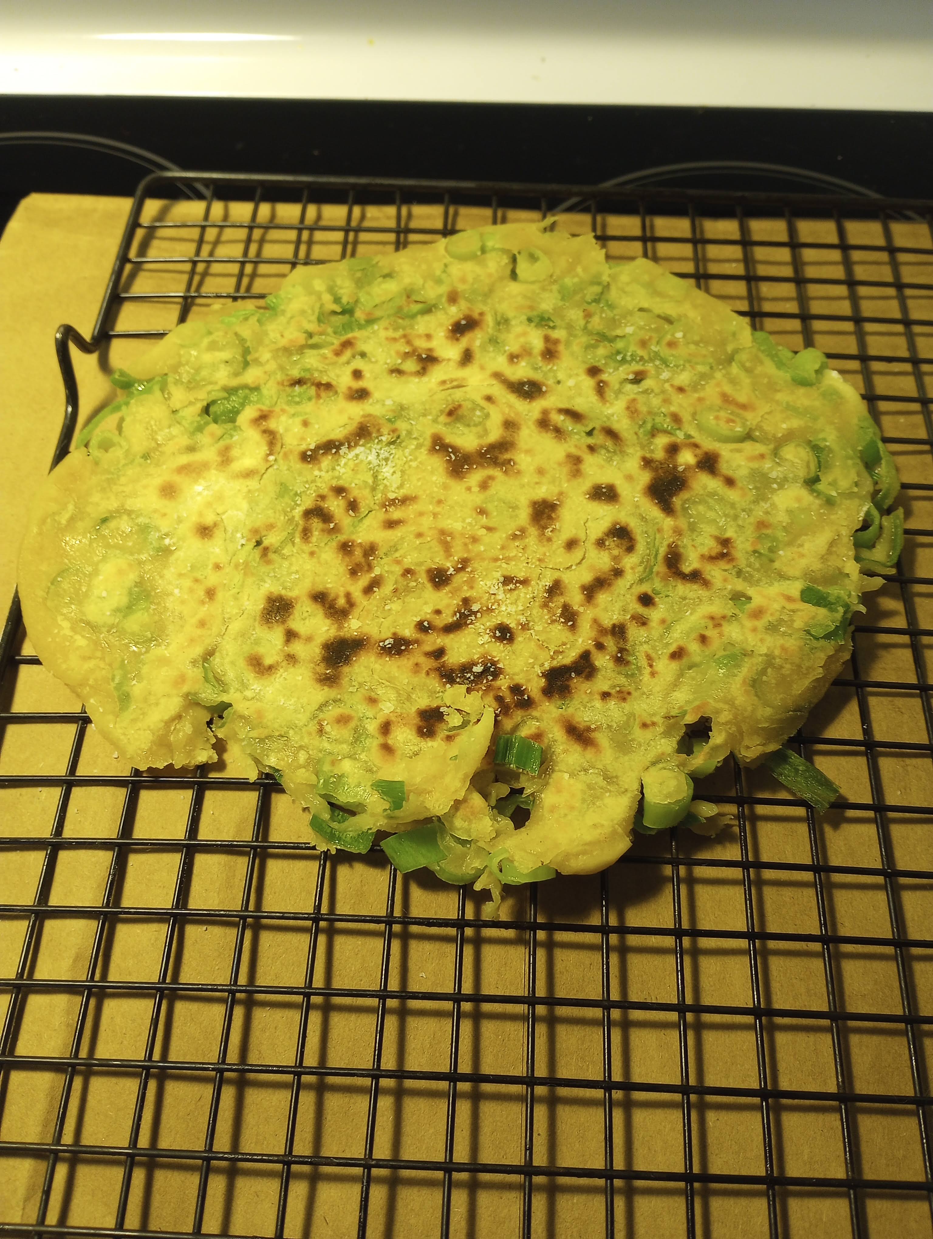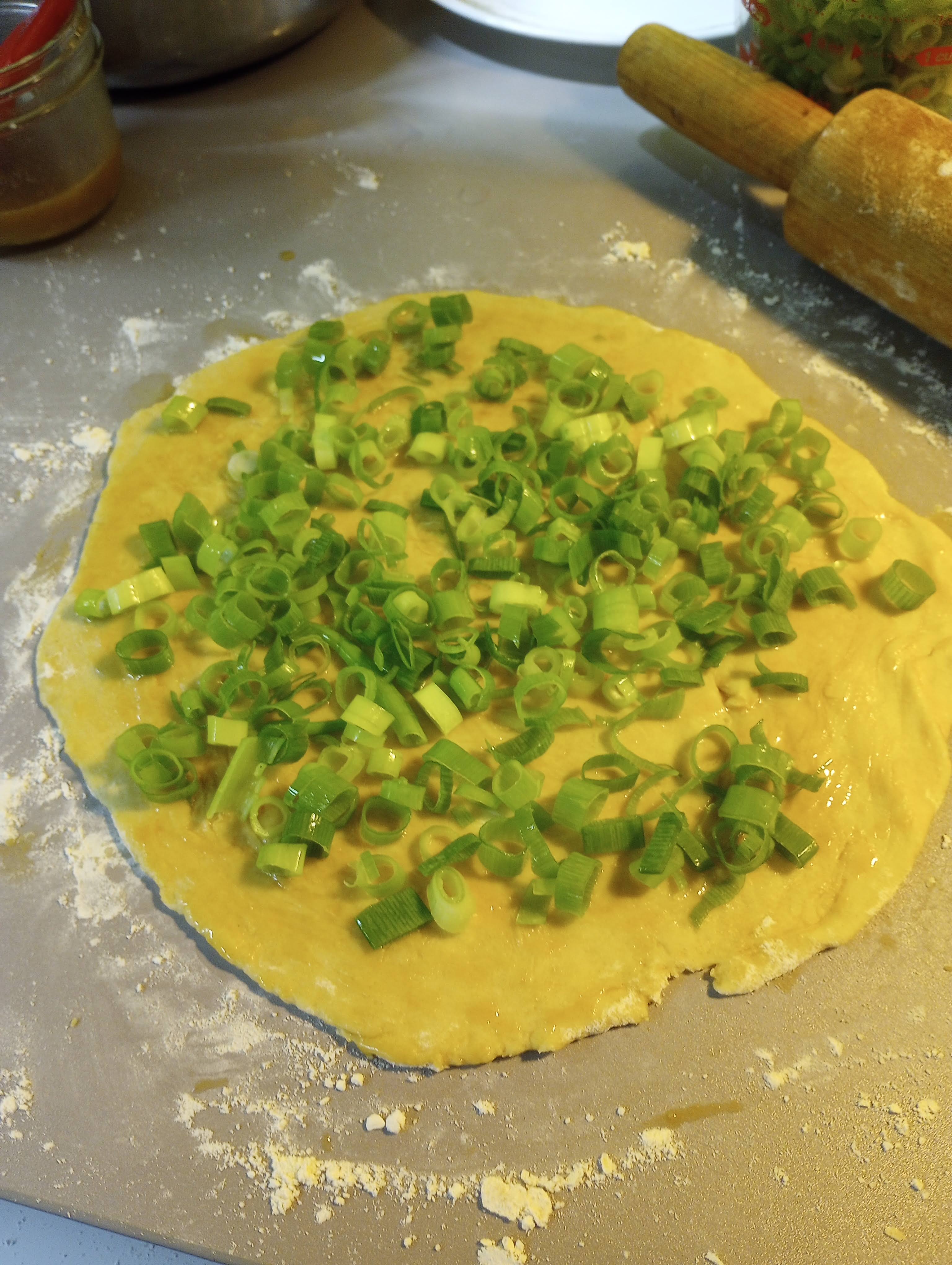 Mr. Food It Yourself is already quite skillful with a wok. I, however, do not have much skill in Asian cooking techniques. I do like pancakes, however, so I decided to try Mr. Lopez Alt’s recipe for Chinese- style scallion pancakes. The recipe uses a very interesting technique. A watery dough is rolled with an oil mixture. Since oil and water are famous for not mixing, the re-flattened dough develops the signature flakey texture scallion pancakes are known for.