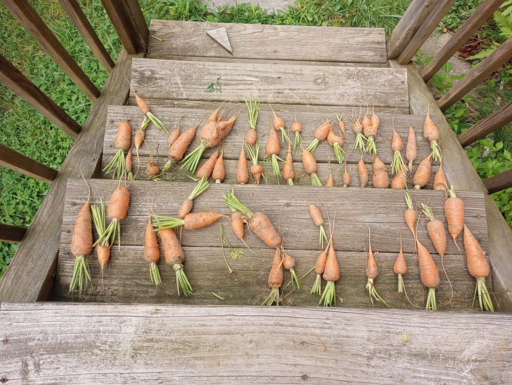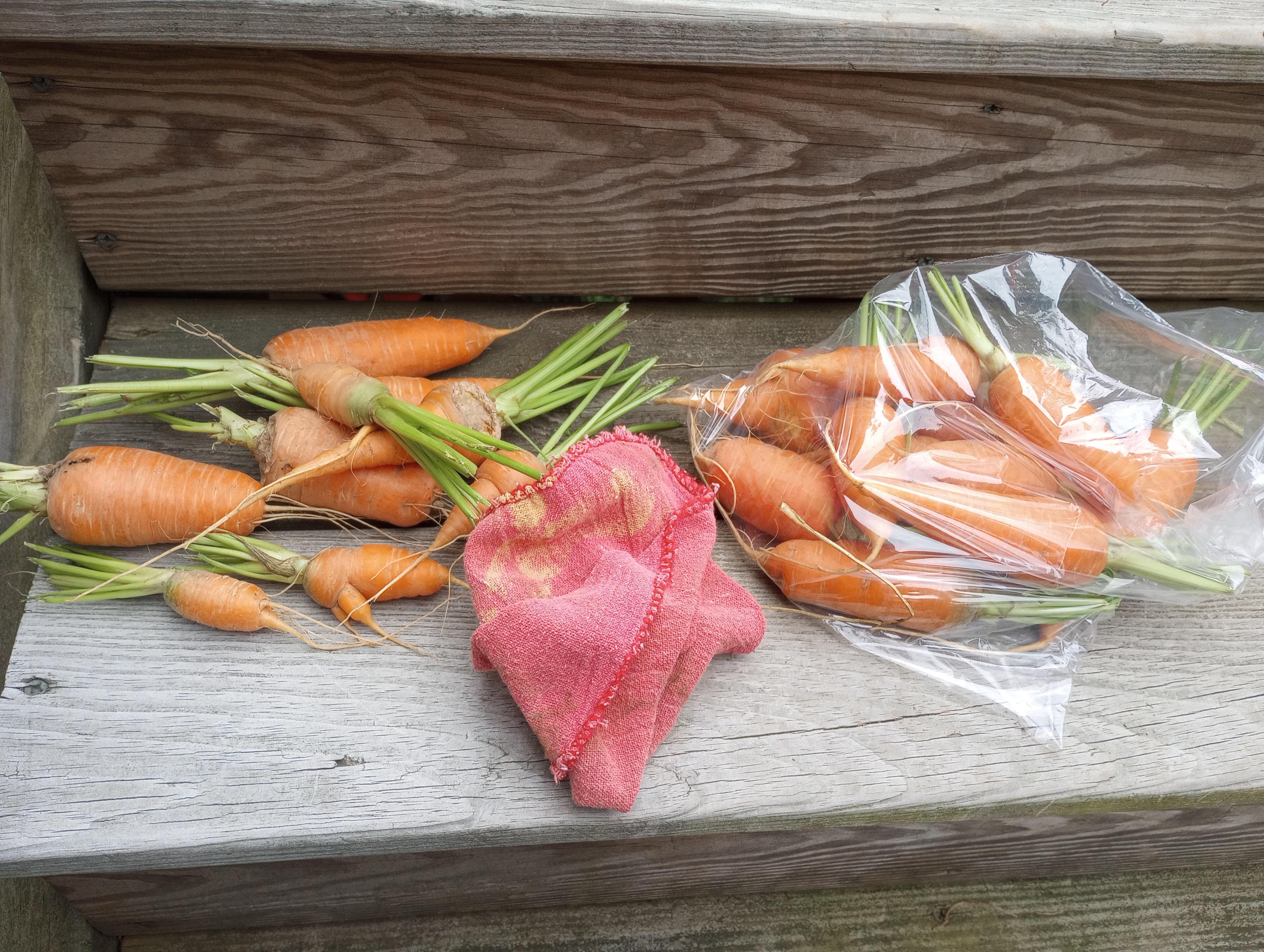 The carrots that are fit for storage I left on the steps to our deck for a while. If those carrots were rinsed off at this point they would never dry enough for long-term storage; they would rot. I wiped off he dirt and divided them between food storage bags. I got one bag of slightly damaged (snail nibbled) carrots. I will use those first. I got two bags of regular carrots and a bag of snack-sized carrots. Unfortunately, the very hot summer left me with snack-sized carrots that are a bit bitter. They will need to be cooked, not eaten raw.