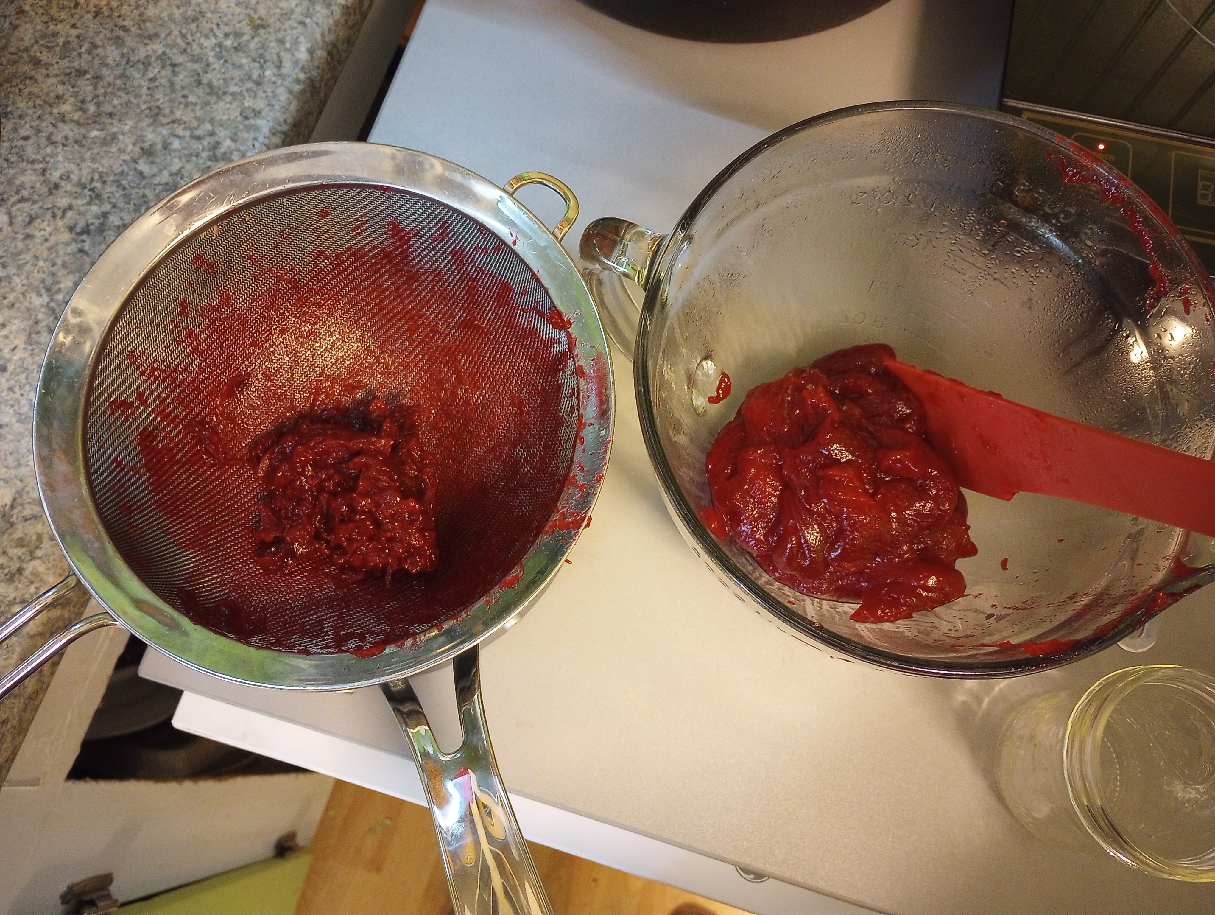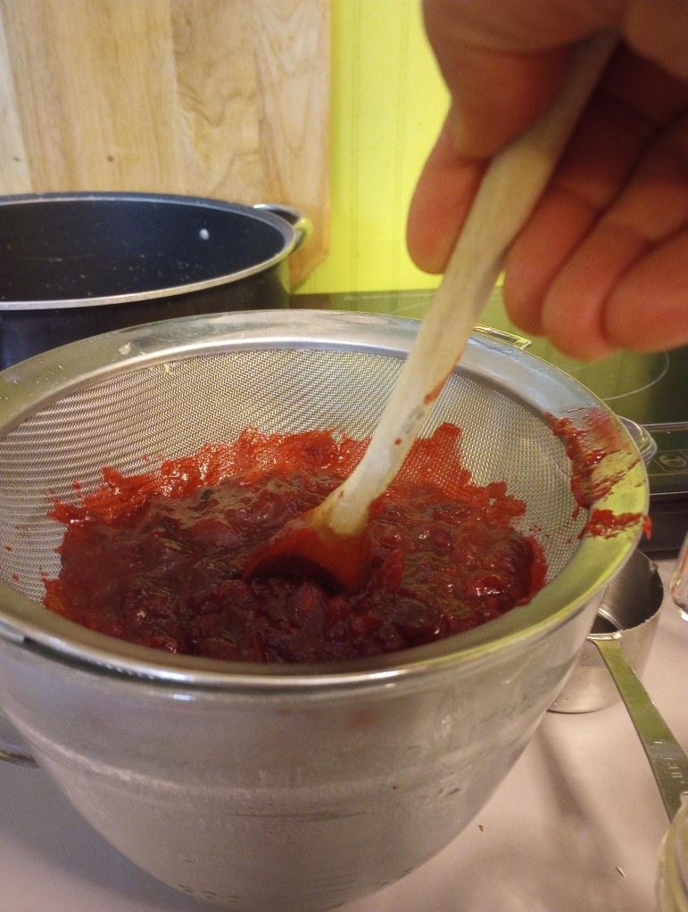 The first step is super simple- just dump the berries, sugar and water into a saucepan. I was surprised that the recipe only required a 10 minute simmer. A little research on cranberries gave me the answer. Cranberries are naturally rich in pectin, the web-shaped carbohydrate compound that makes jams and jellies jell. Over-cooking will break down the pectin and prevent the sauce from setting up. The berries popped open and broke down just fine in the 10 minutes I had them on the stove. The most difficult part of the whole process was getting the cooked berries through the mesh strainer. I switched from a wooden spoon to a rubber scraper. It worked better. Here is what I was left with after the straining phase: