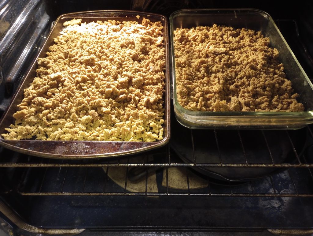 When the loaf is cool enough to handle, but still warm, crumble it against the large holes of a grater. You can also cool the loaf completely and give it a spin in a blender or food processor. (Use the pulse setting so you can control the size of the crumbles.) Spread the crumbles on a baking sheet or pan- something with sides- and put back in the oven at 250F. I used one jelly-roll pan and one casserole dish. You don’t want the crumbles layered too deep.