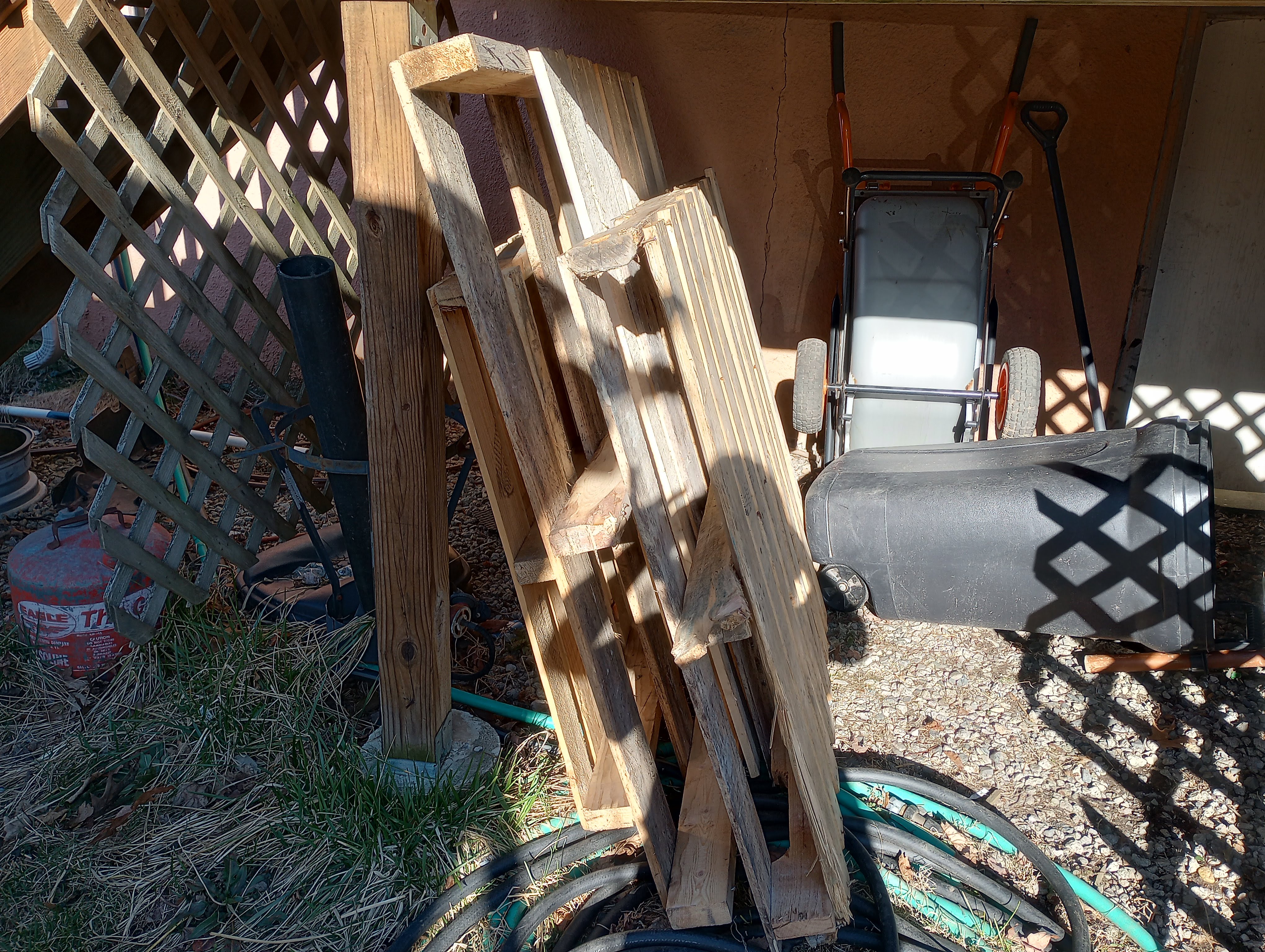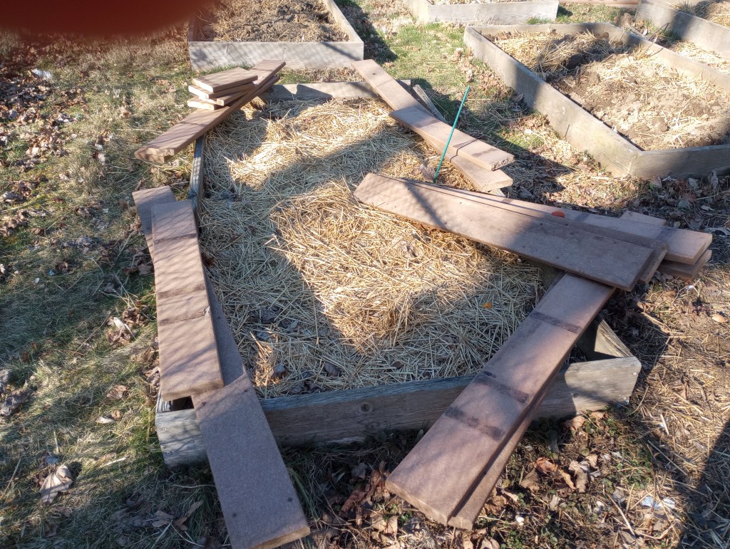 Some of our raised beds are showing their age, also. Last fall, Mr. Food It Yourself and I collected some composite decking from neighbors who took down an above-ground pool. With the help of my dad, I have been cutting and piecing lengths together to replace the most worn boxes. We are quite proud of how we are recycling this material.
