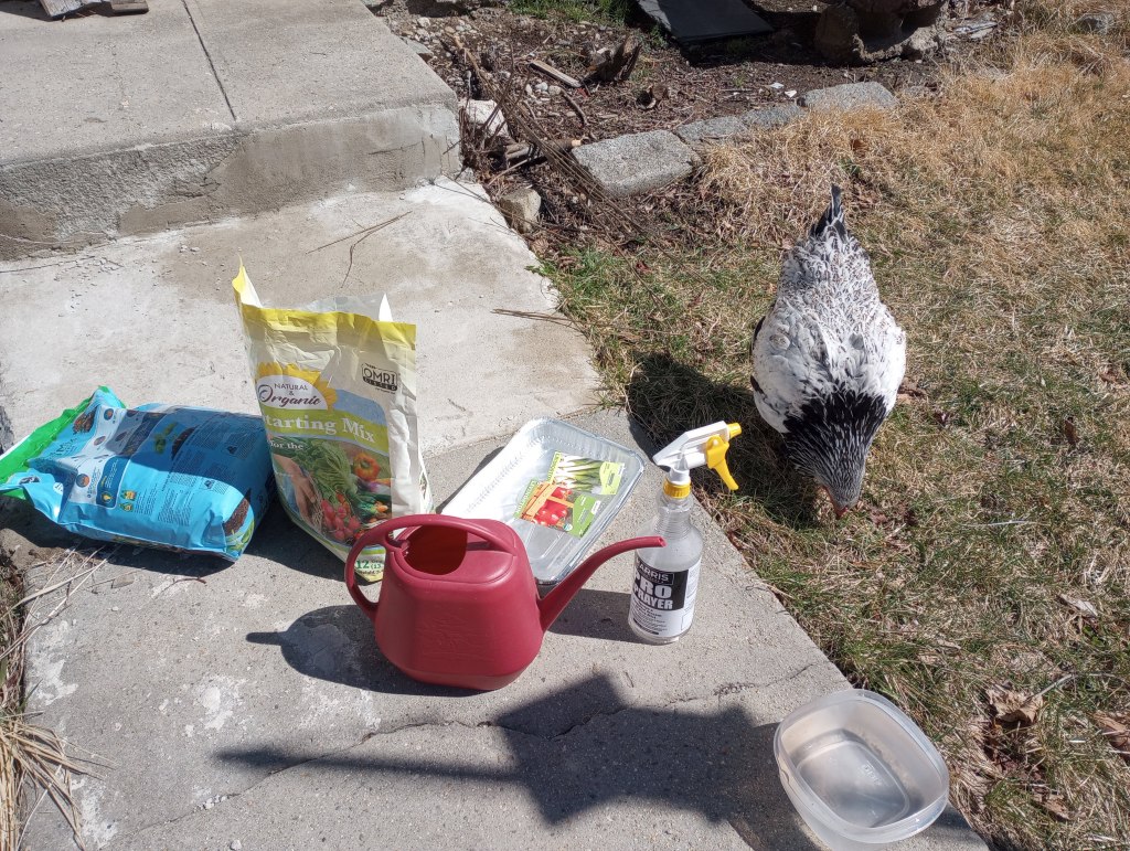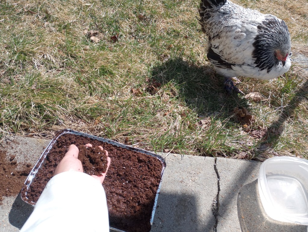 Yes, our helpful chicken Hennifer Aniston is still admitted to Kitchen Heneral Hospital. We are quite confident she will integrate back into the flock soon, though. She has been increasing her stamina as we give her more and more time outside (she helped me start seeds today as you see). She is putting on weight and is acting much less like a sick bird.