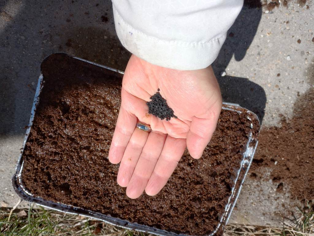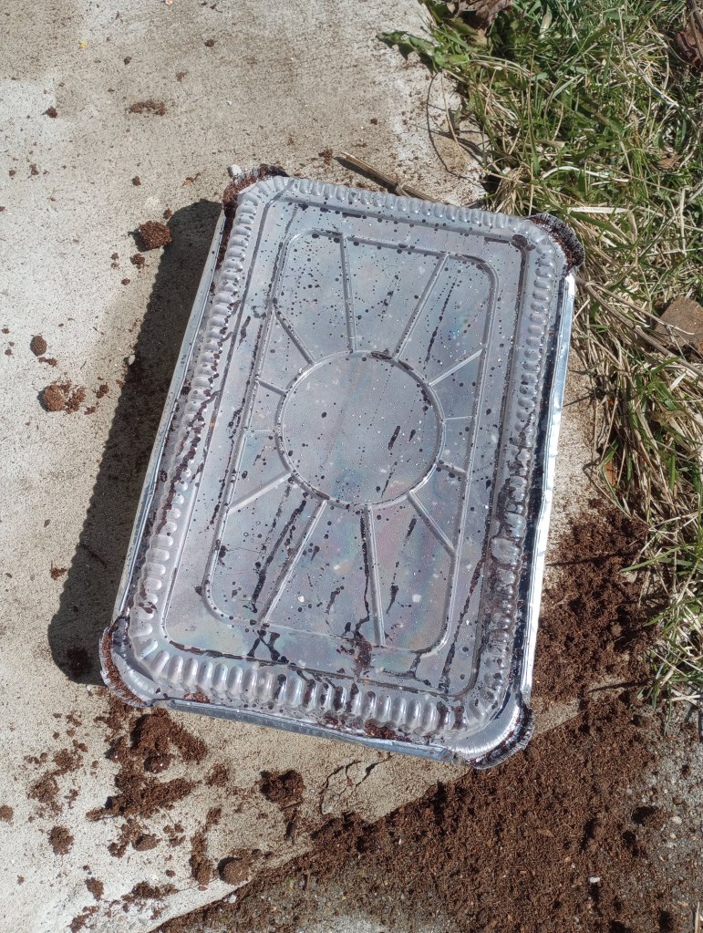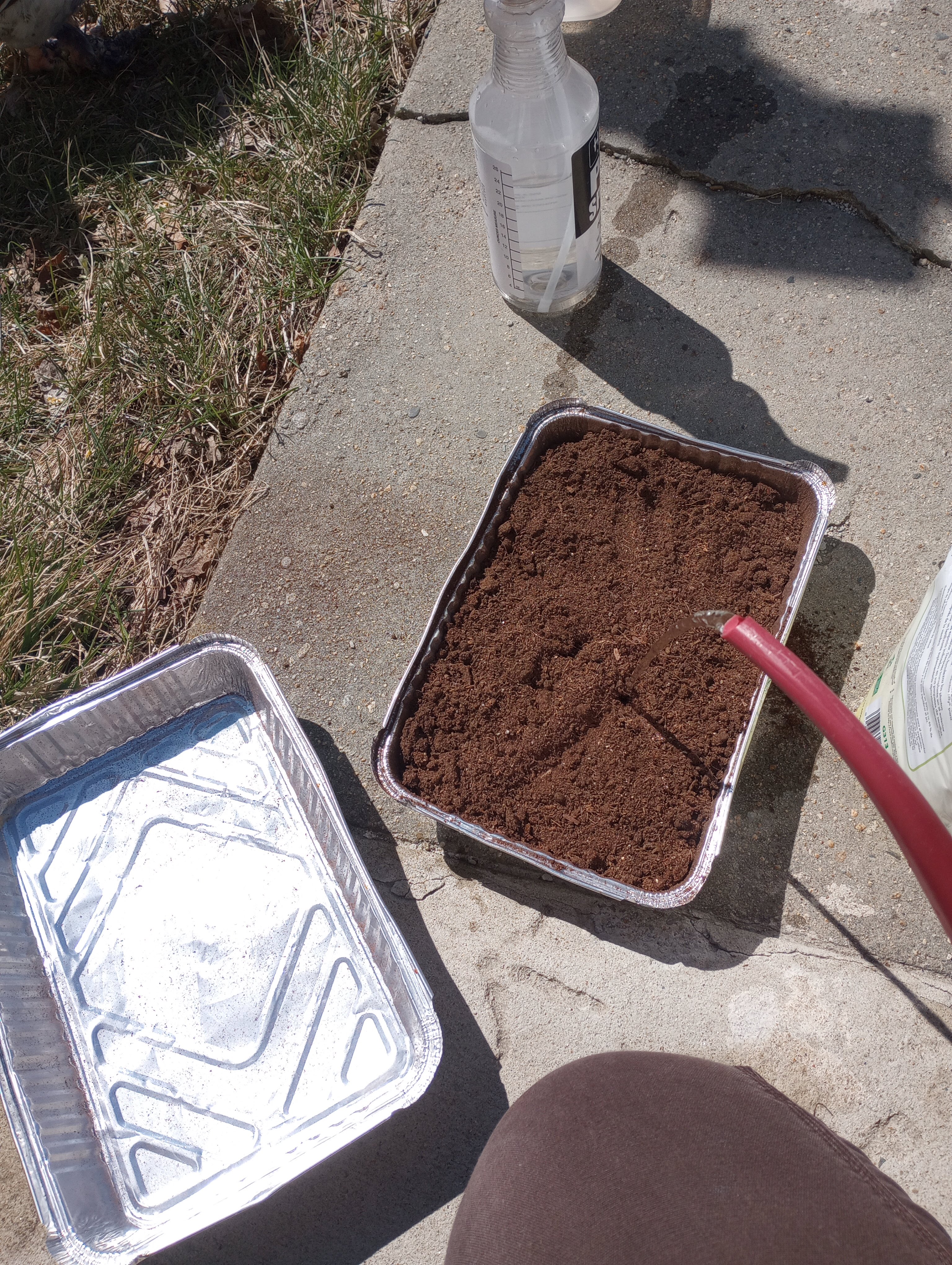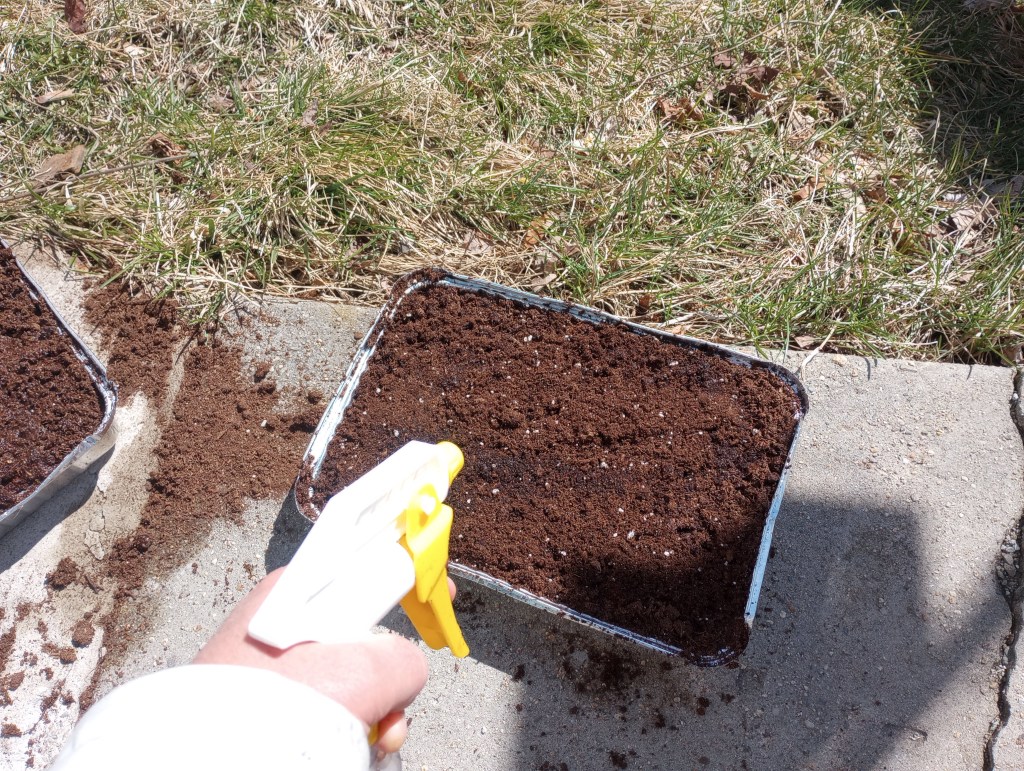 I filled the aluminum pans with potting mix and added water from the watering can. This took a little time to absorb into the soil.