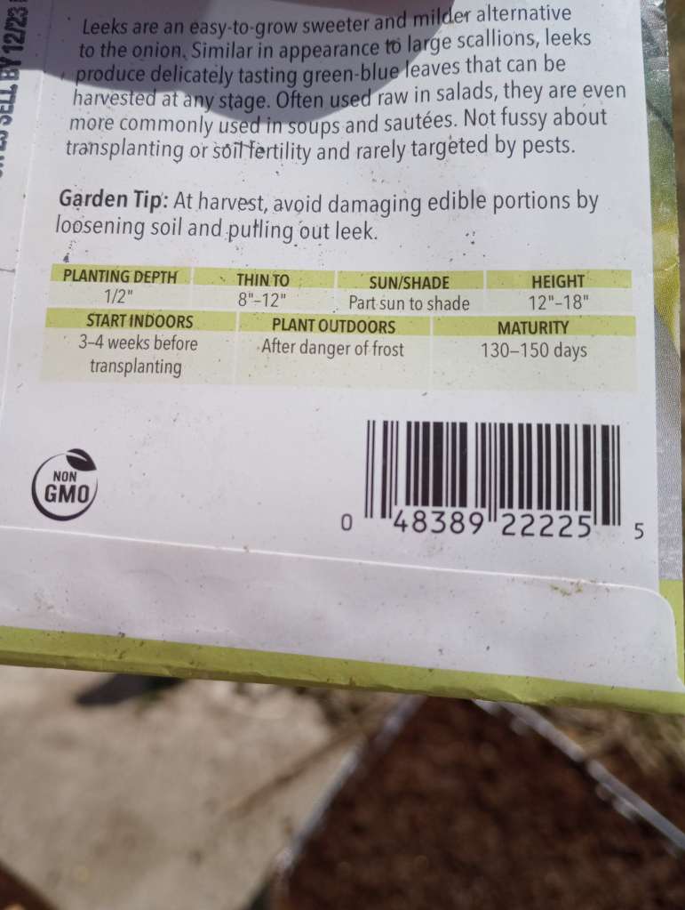 Next, I checked the seed packets. According to the seed company, leek seeds need to be planted 1/2 inch deep. I sprinkled the seeds on the moist potting mix. I topped them with 1/2 inch of potting mix and used the spray bottle to moisten. I repeated the process with some Roma variety tomato seeds, except these needed to be planted 1/4 inch deep.
