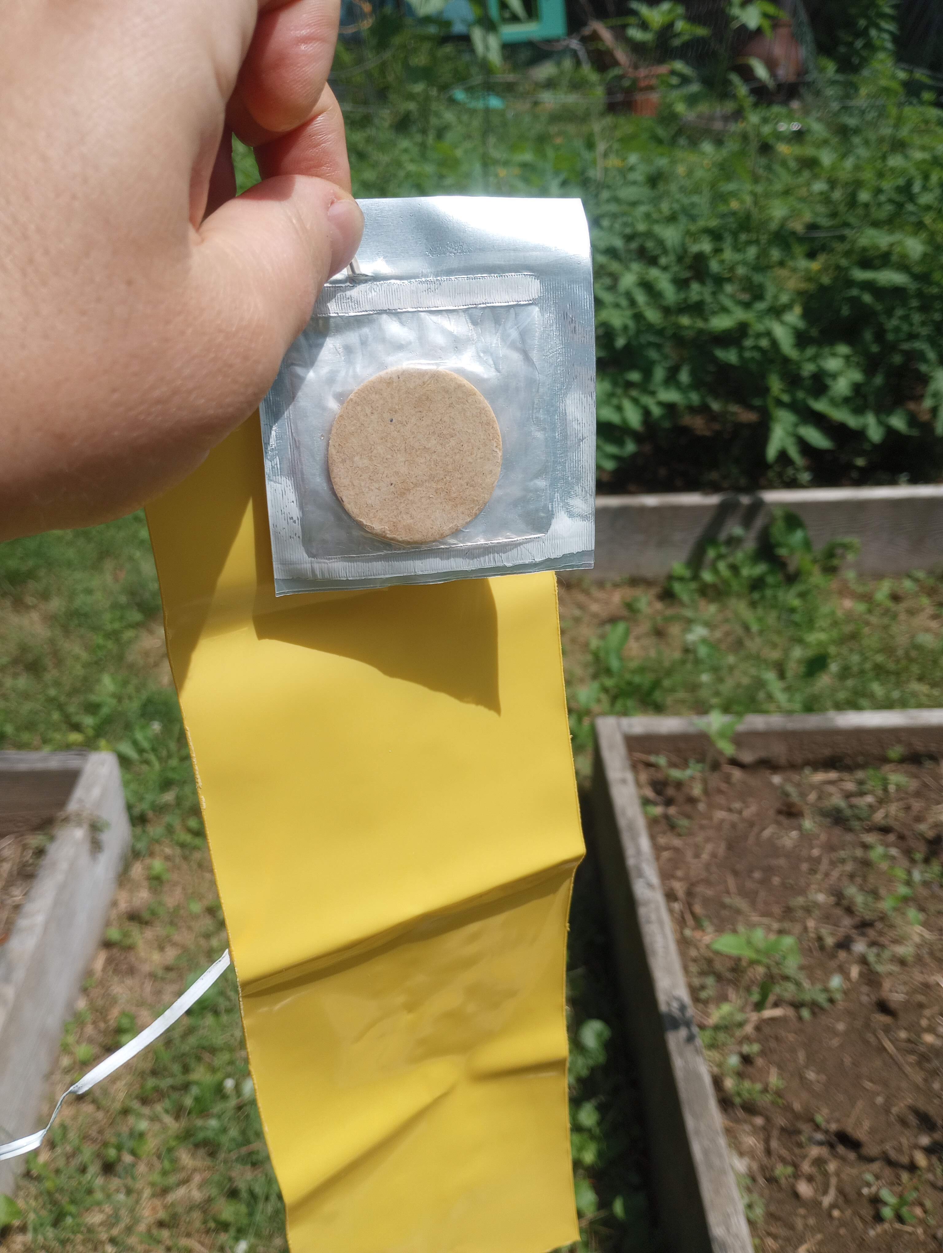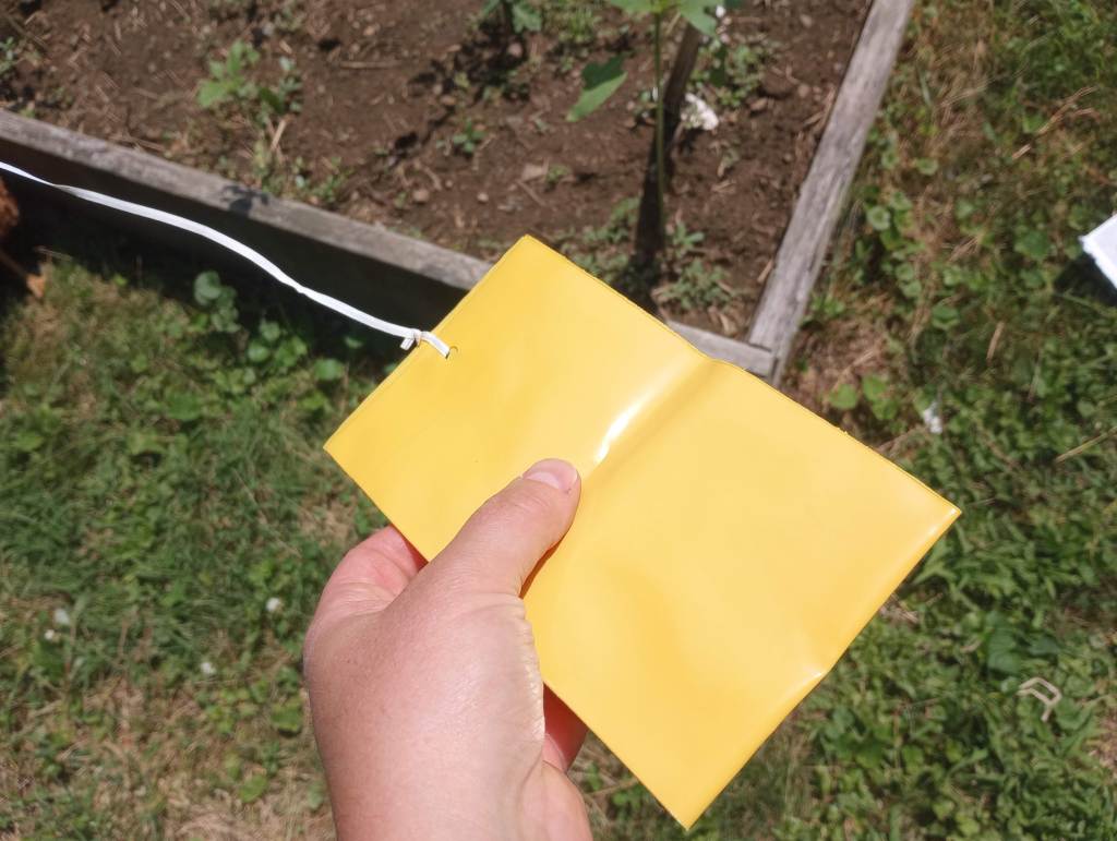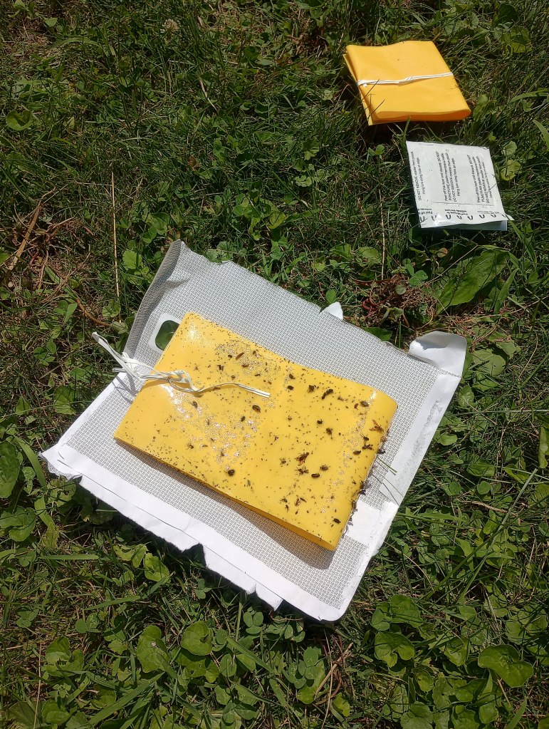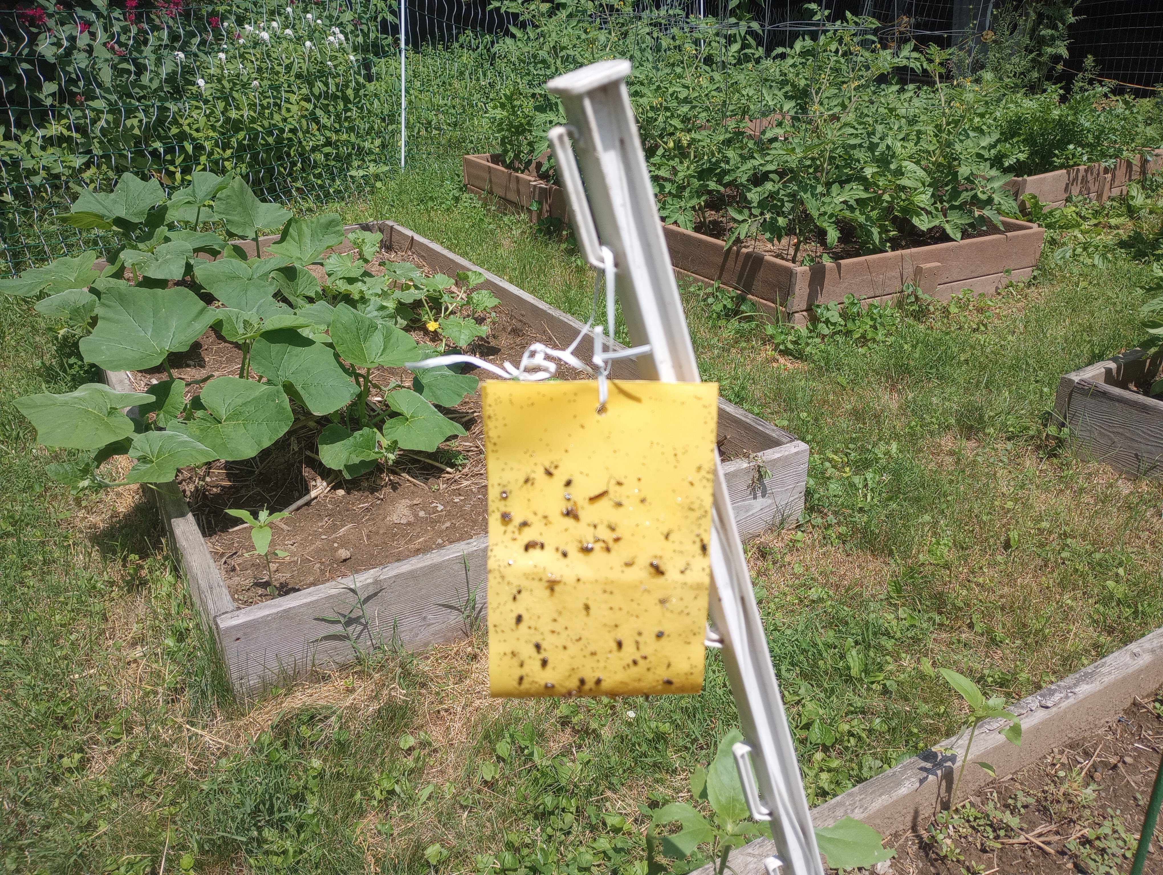 We have had decent luck managing the cucumber beetle issue in the raised beds. If you recall, we have not grown anything in the squash/cucumber/melon family for two years due to a major cucumber beetle infestation in 2021. We previously tried sticky traps to foil the cucumber beetles, but found them woefully inadequate. Only this past winter did I learn that a scented lure is required to bring the beetles to the trap. This is a game changer. Observe…