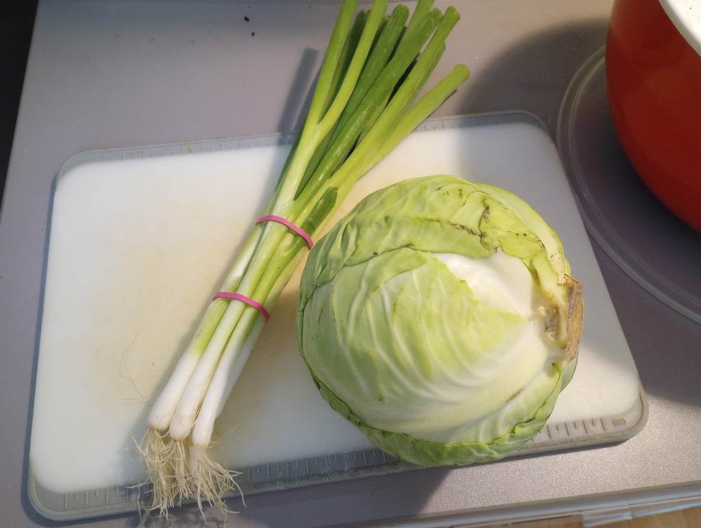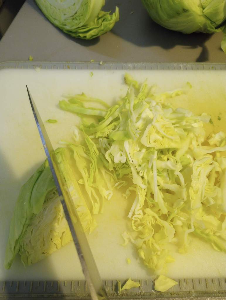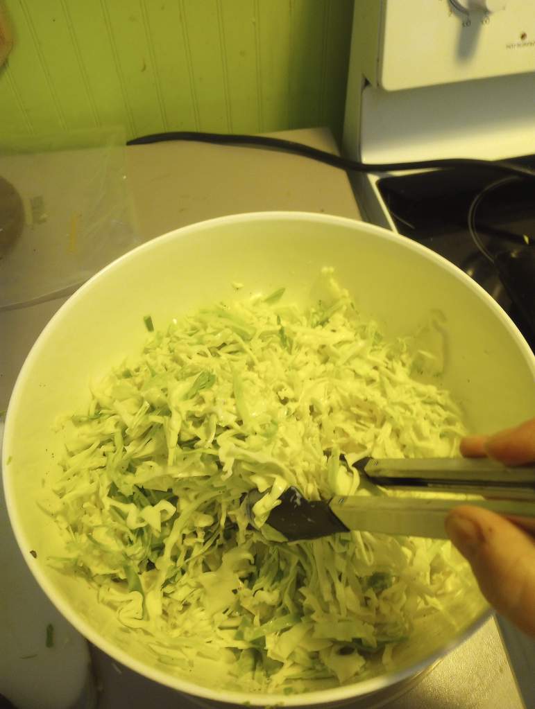 Now, we must consider the veggies. The one consistent vegetable used in coleslaw is cabbage. I use green onion (scallions) and cabbage. For the volume of dressing described above I find a 2.5 lb cabbage is just about right. Mr. Food It Yourself can not eat raw carrot, but you can add carrot if you wish. You can use another type of onion. You can add celery, pear, apple, cucumber, kelp, or kale. This is your food. Make it with what you enjoy.