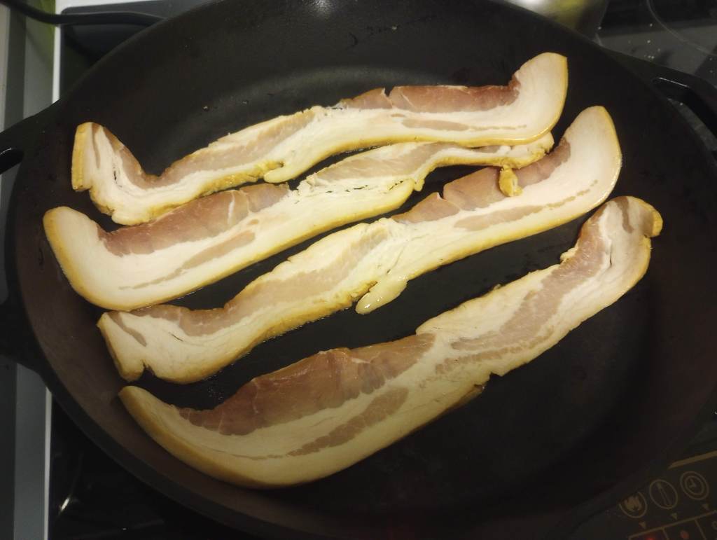 I started with the bacon. I like my bacon crispy, and that means slowly rendering out the fat. A cast iron skillet is the perfect choice for this process.