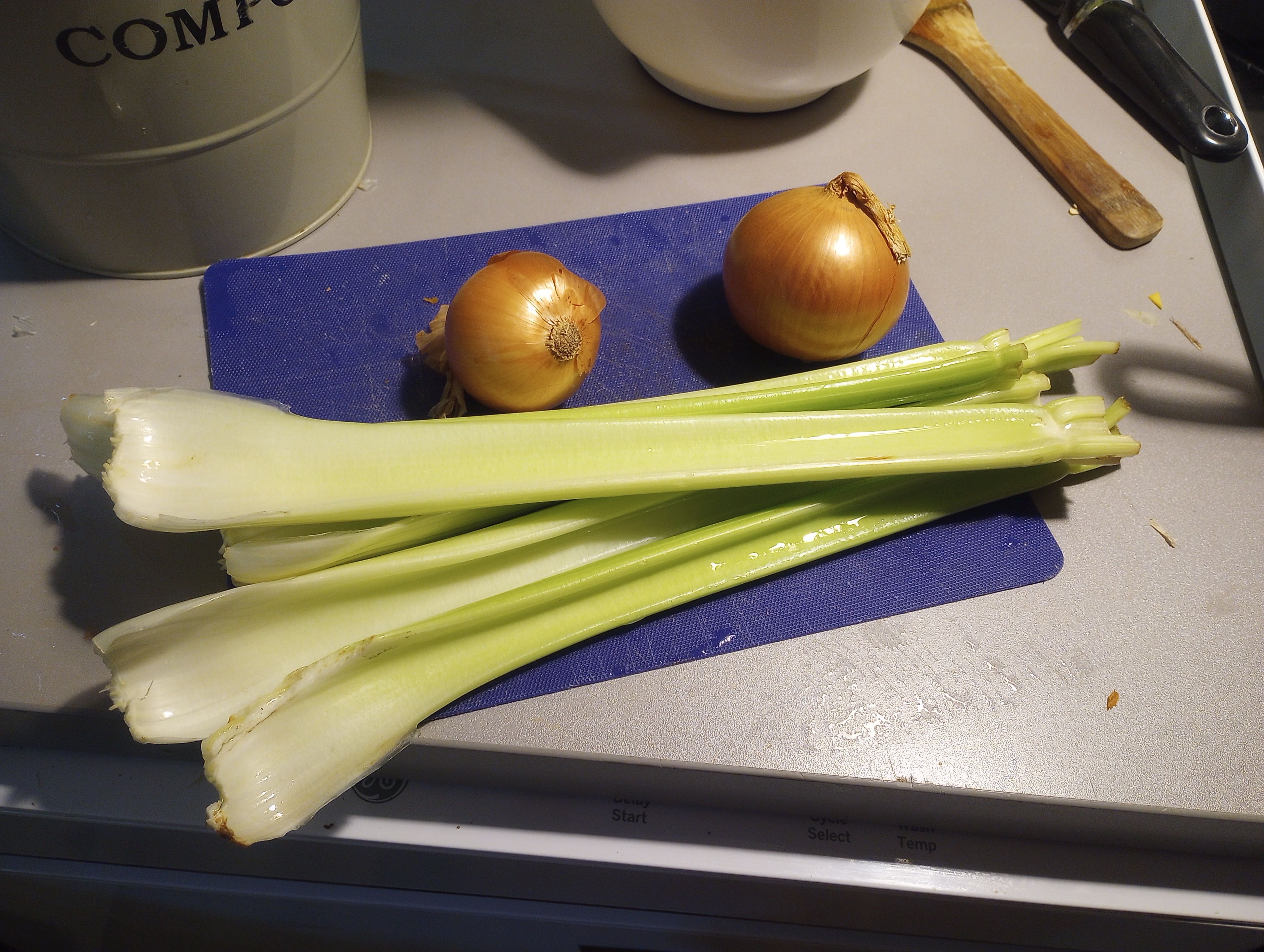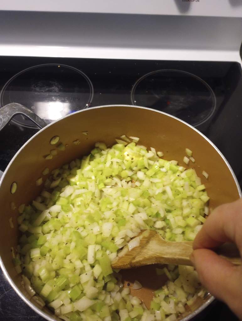 I like a good measure of onion and celery in my stuffing. I chop it fine. The back of the stuffing mix box has measurements listed, but I just follow my heart. I sauté the chopped veggies with butter. Sometimes I add fresh herbs. Tonight it was cold outside and I didn’t want to venture into the garden to pick any. Then I add the stuffing mix (I won’t give away my favorite brand, but if you heard it, it might ring a Bell) and the prescribed amount of water.