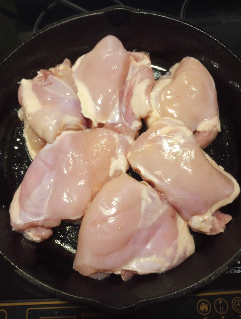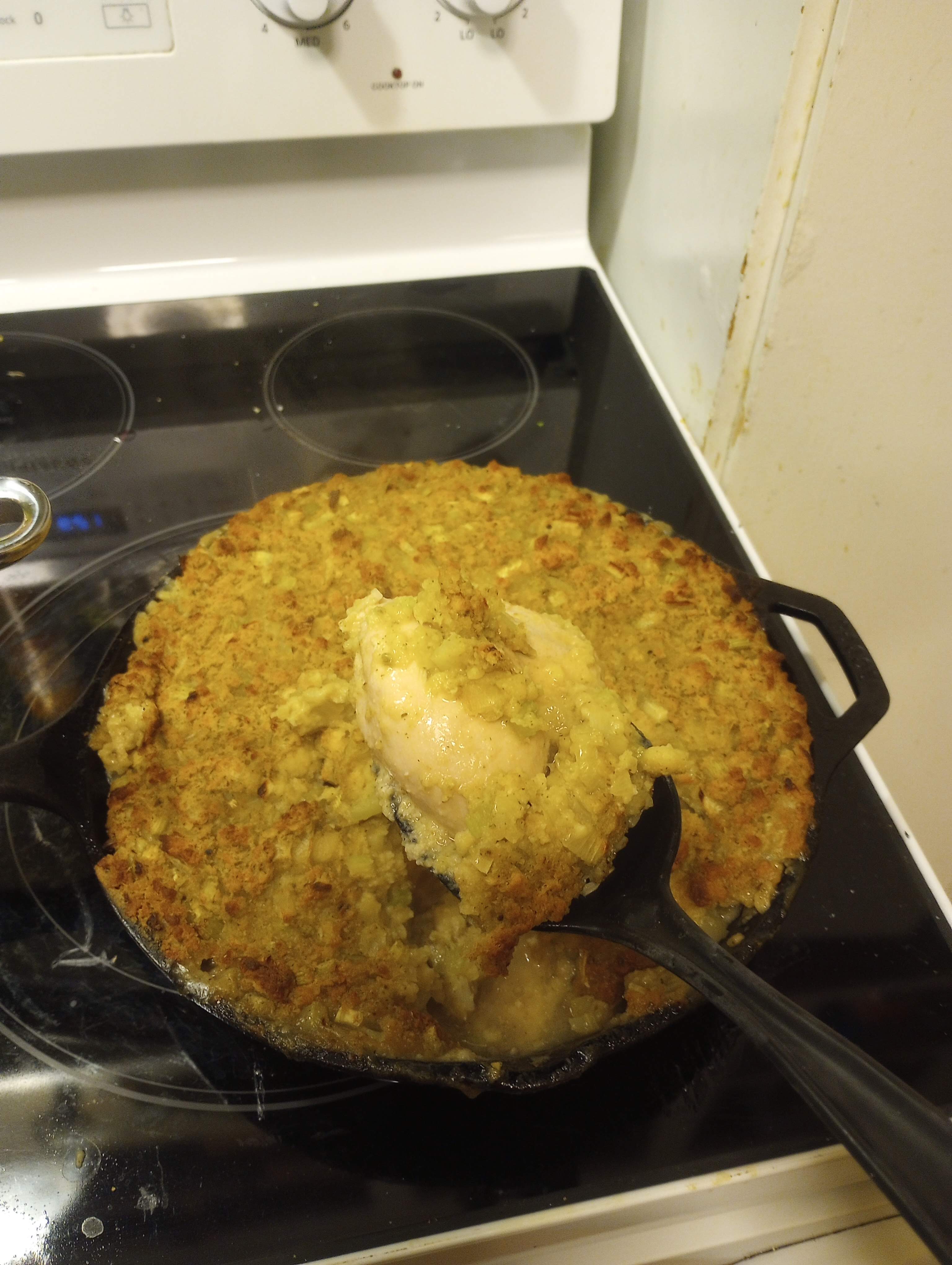 Tonight, I used skinless, boneless chicken thighs for the protein portion. Chicken breast, turkey cutlets or tenderloins, pork loin, even sliced extra-firm tofu would work. Use the protein you have. I topped the thighs with the stuffing and popped it into the oven, pre-heated to 350F until the chicken hits 167F. It took about 45 minutes.