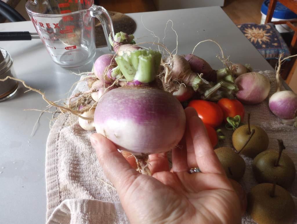 Our cucumbers were so promising at the start of the season. I was ready to make quarts of pickles. However, the plants never recovered from an early heatwave. We had a few cucumbers for salads, but no pickles to put up. Thankfully, our turnips did well enough that I was able to make pickled turnips. I used a lacto-fermented pickle method. The chopped turnips were fermented for about 6 weeks in a 30% salt solution seasoned with Chinese five spice powder and a little red pepper flake. Fun fact- they are especially tasty with roasted butternut squash.