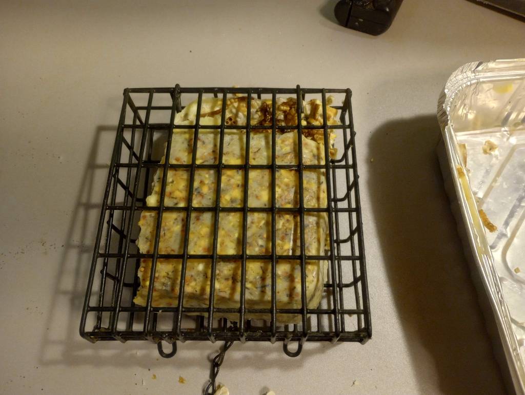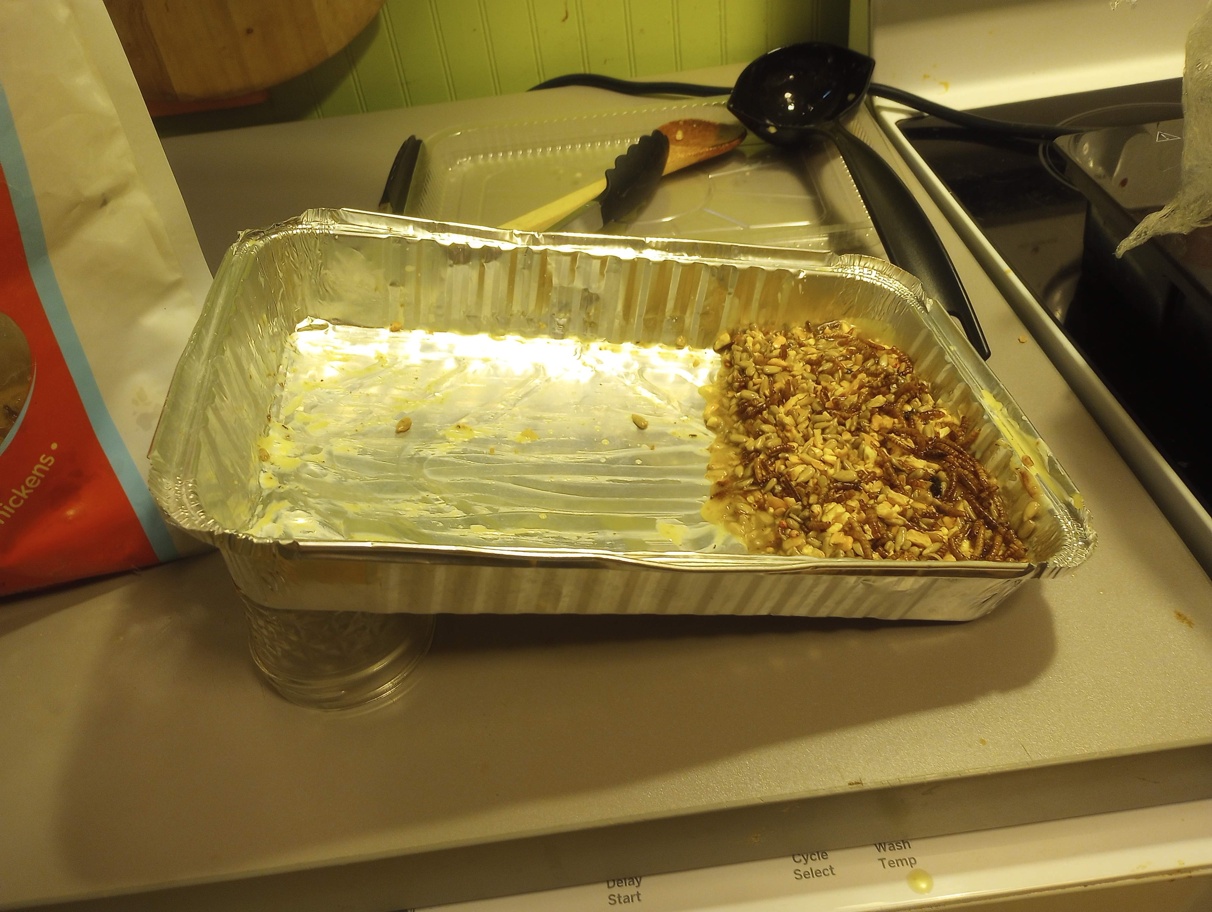 I chopped my suet, placed it in a Pyrex bowl and covered with plastic wrap. While the microwave worked it’s 20th century magic, I mixed scratch grain, raw sunflower seeds, and meal worms (all high calorie chicken treats) in an upcycled foil pan I had kicking around.