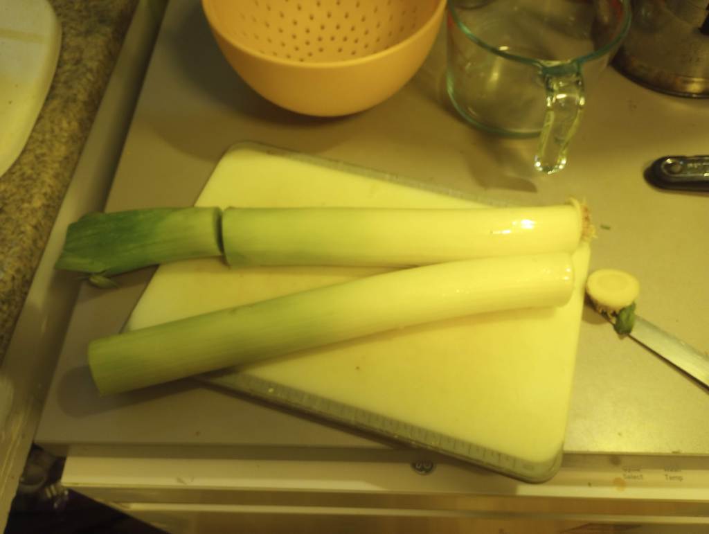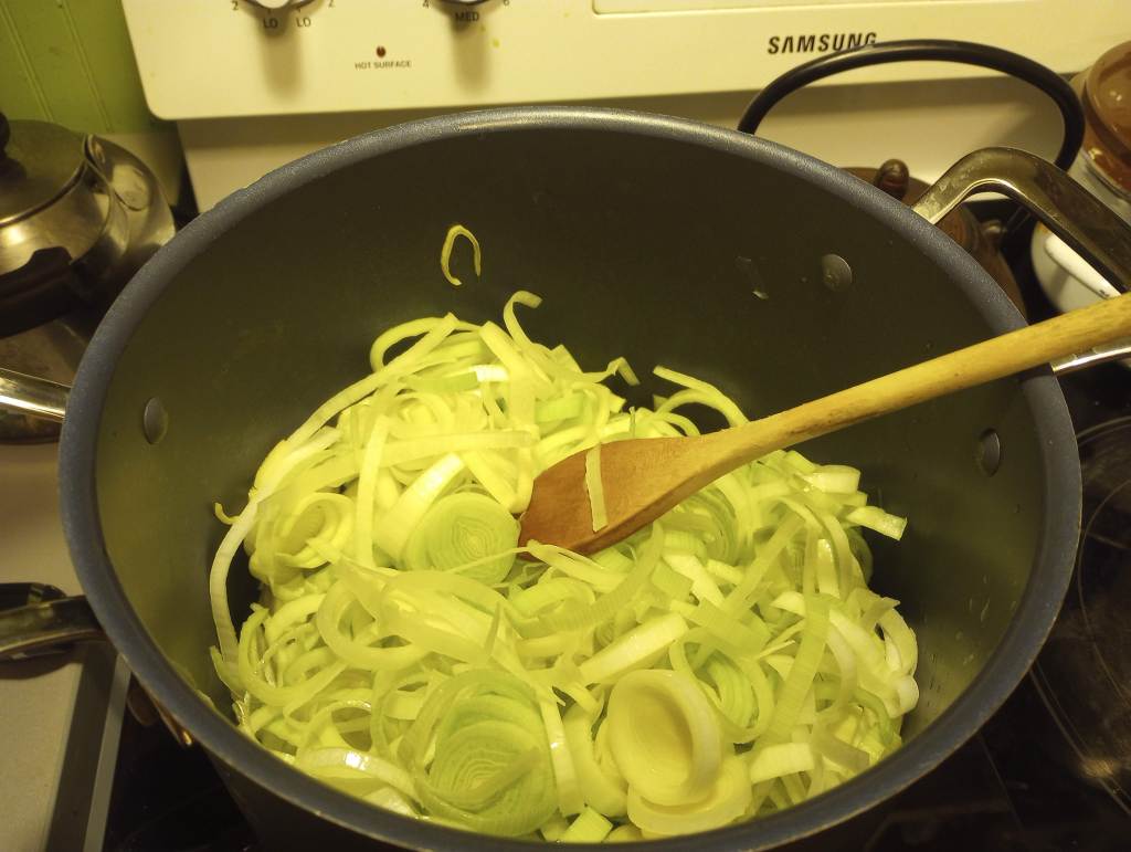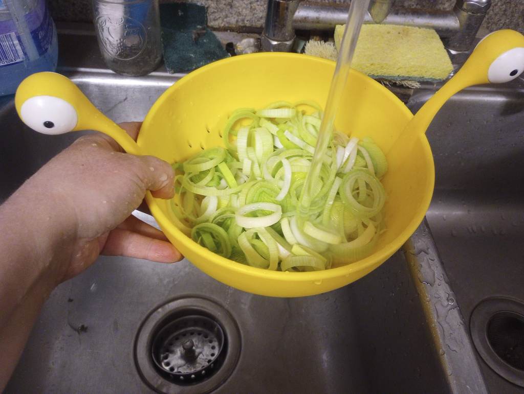 These leeks from the supermarket are much bigger than the ones I grew. Slice the white and tender green parts of the leeks, then rinse the slices. Dirt gets stuck in the leeks’ layers and I have found this is the best way to make sure they are clean. Note: You just sliced grungy leeks. Wash your knife and cutting board before proceeding.