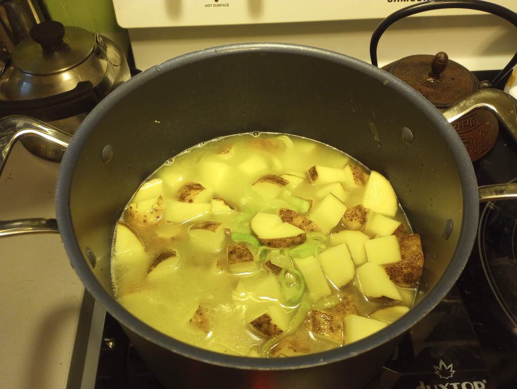 Next, sauté the leeks in butter until soft. Then, add the chopped potatoes and water or broth to cover. I had chicken bouillon, so I used that. Also, I did not peel my potatoes. I almost never peel potatoes. You do you, though. Let that all simmer together until the potatoes are cooked.