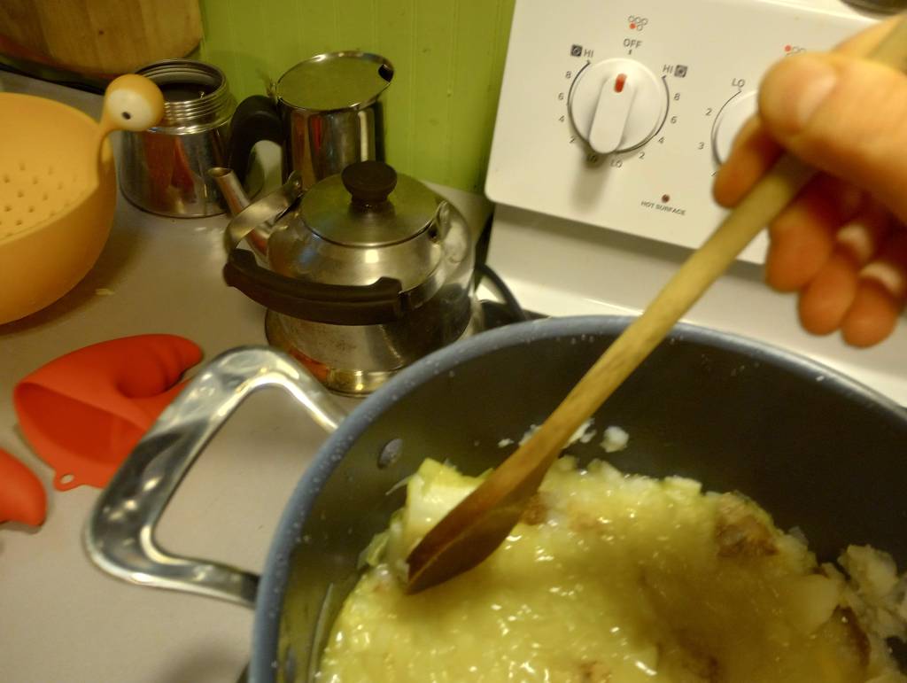 While that happens, a decision must be made: what texture do you want your soup to be? You can dish this soup up as is- broth with vegetables intact. You can puree it smooth and call it by the very fancy name vichyssoise (pronounced vee-shee-SWAZ). Or, you can squish some of the potatoes with the back of your cooking spoon and make a thickened base with little chunks. The choice is yours. I chose little chunks.