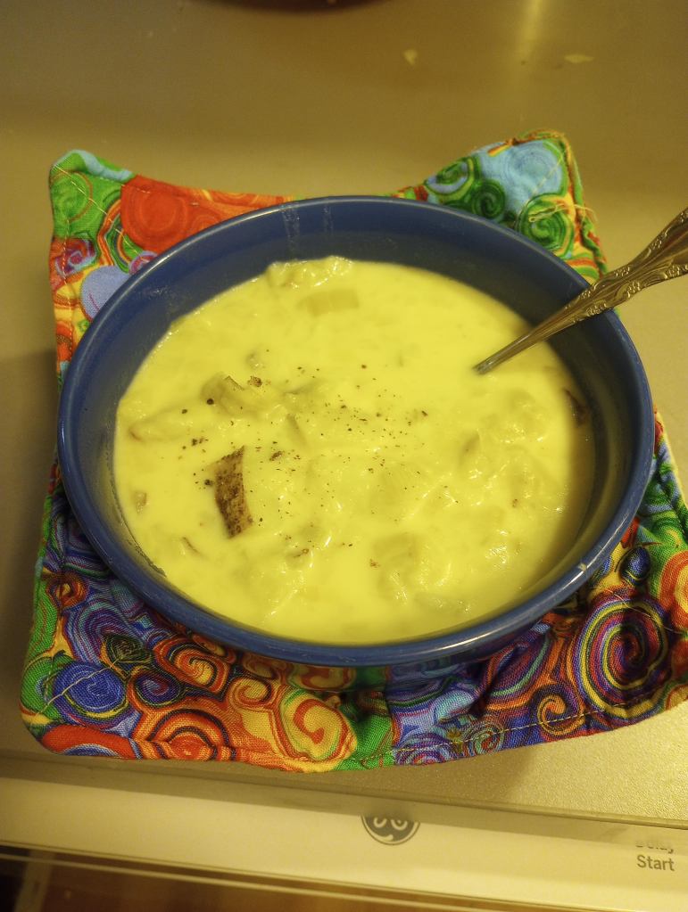The recipe says to finish the soup with cream or butter just before serving, but I used evaporated milk. I find cream too heavy. You can add whatever you like: milk, half-and-half, cream, or even a non-dairy milk substitute. This is soup. There are no hard and fast rules. With a quick grind of black pepper, the soup was complete. Behold!