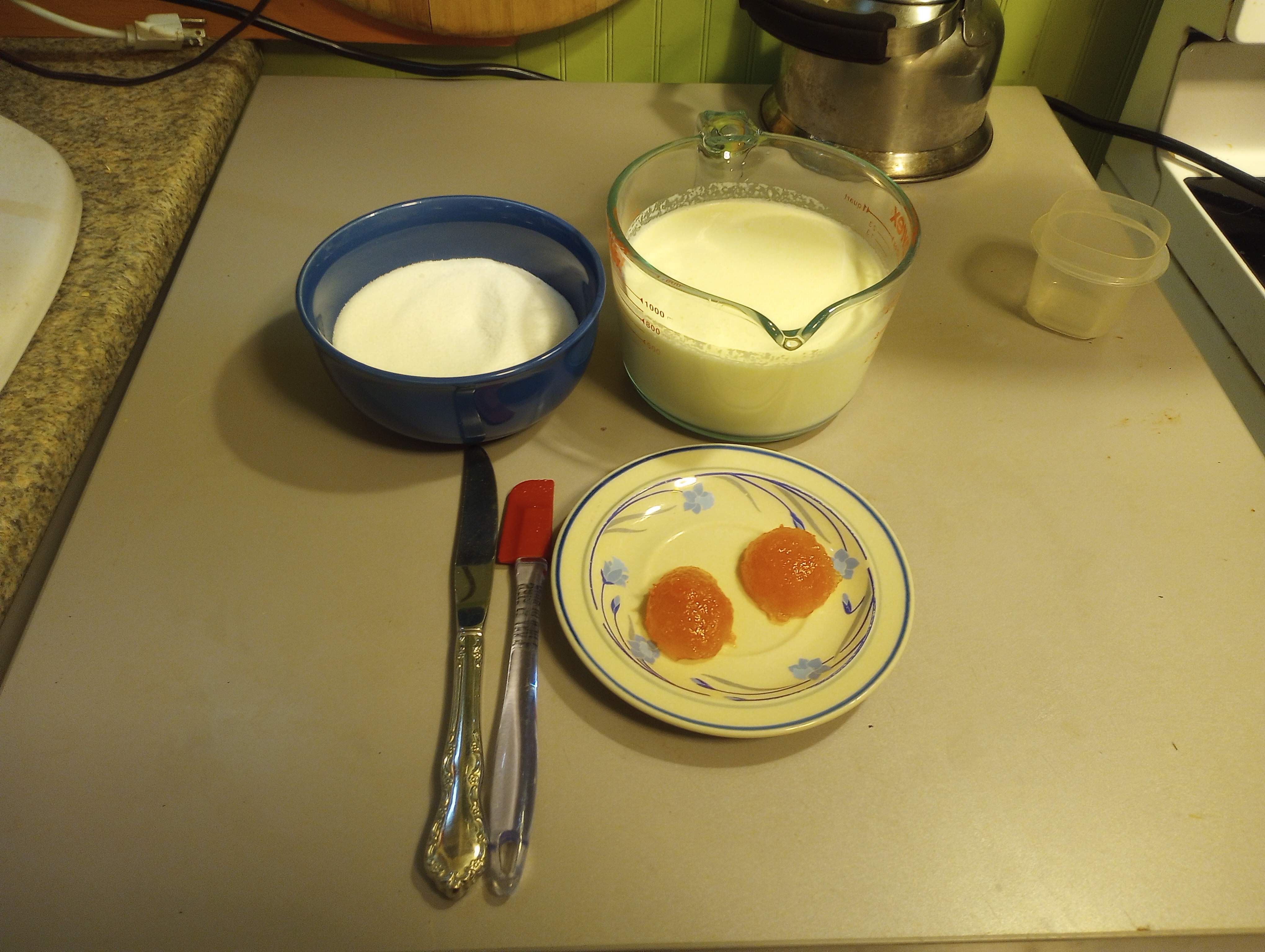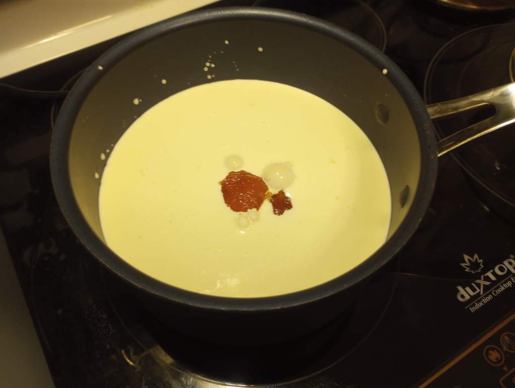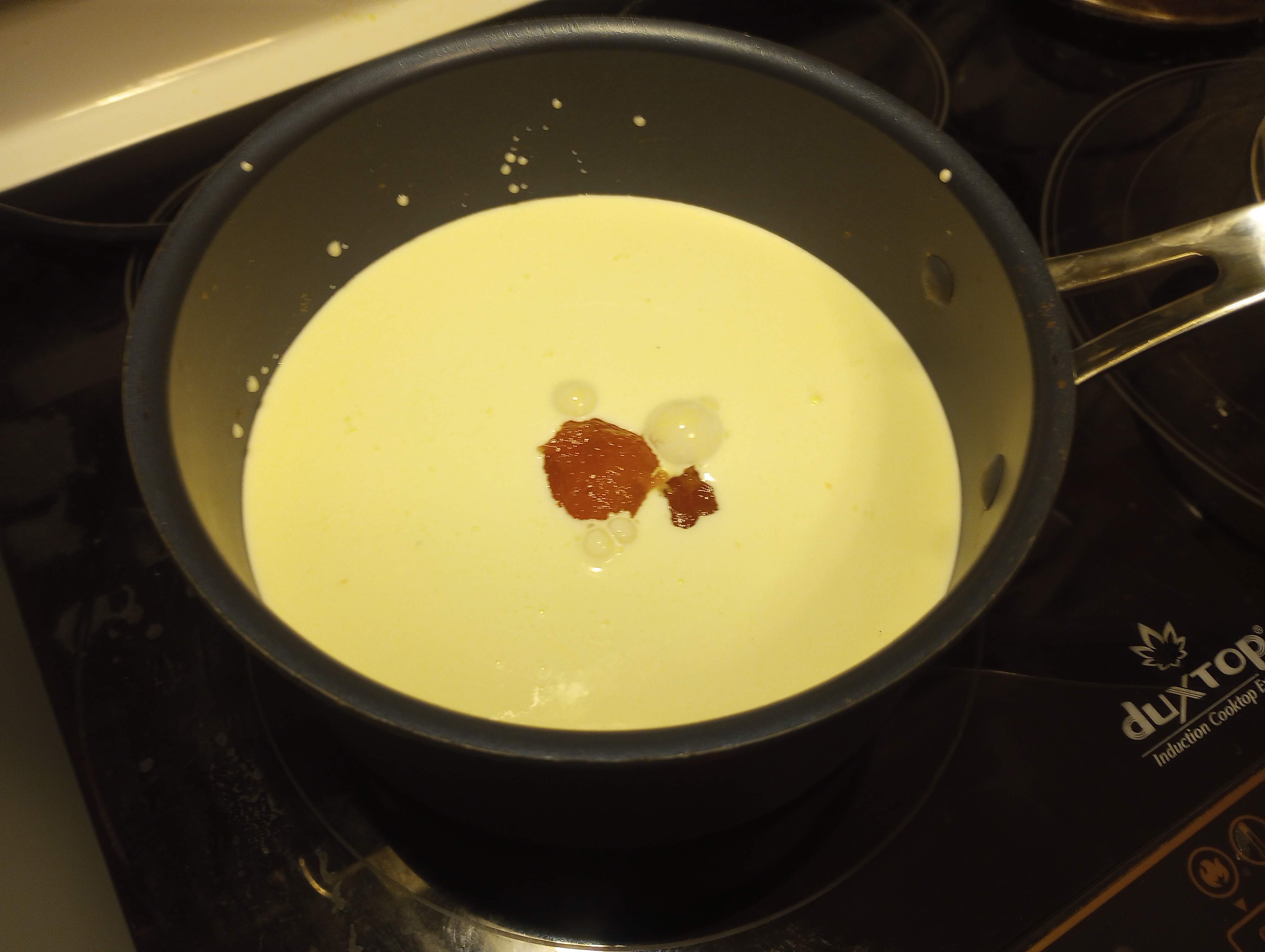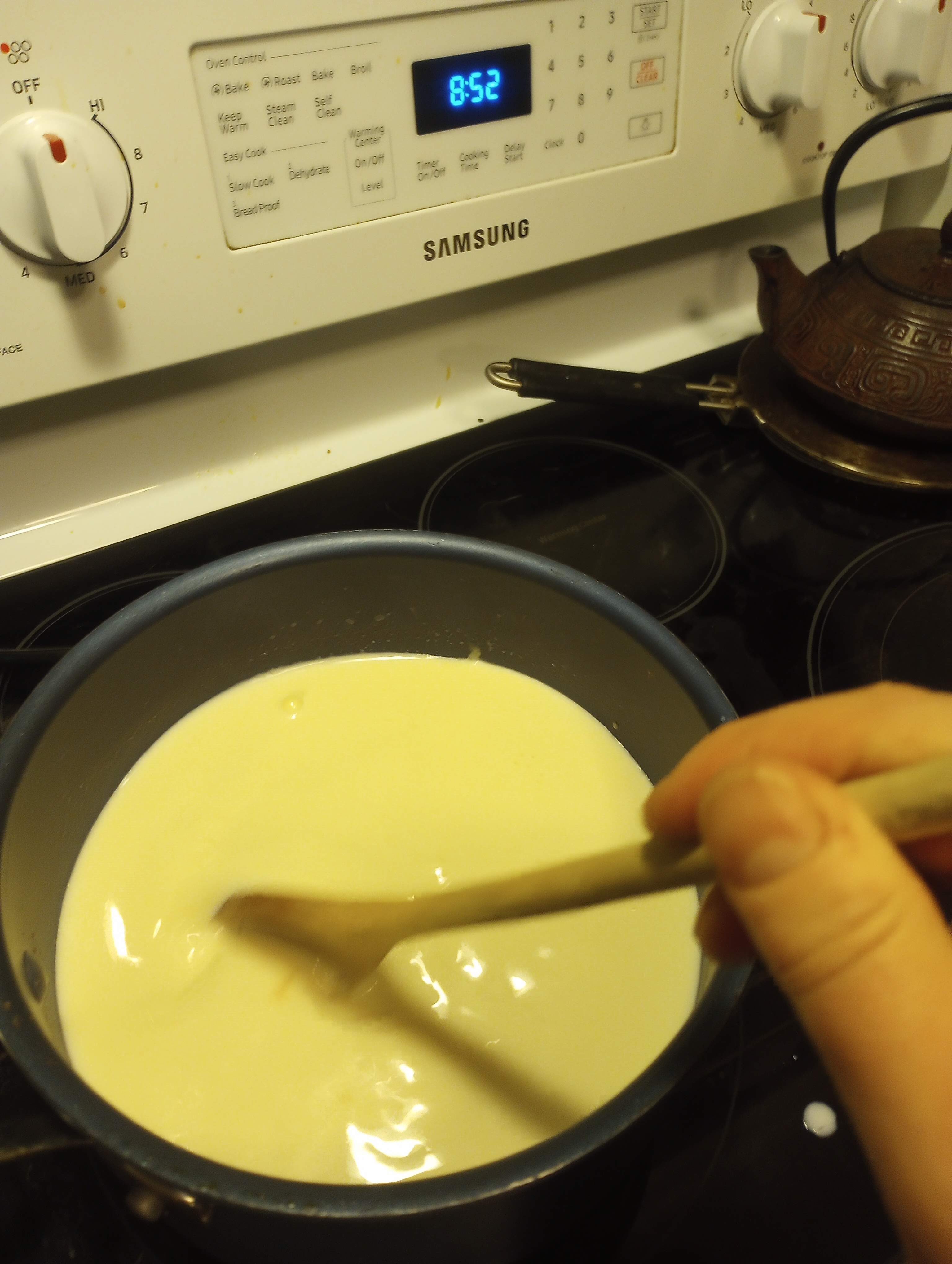 We measured out the ingredients, mixed them in a sauce pan, and heated them together as instructed. We did “cheat” on the vanilla bean part an just used a good dose of vanilla extract. Mr. Food It Yourself measured with his heart, as one should.