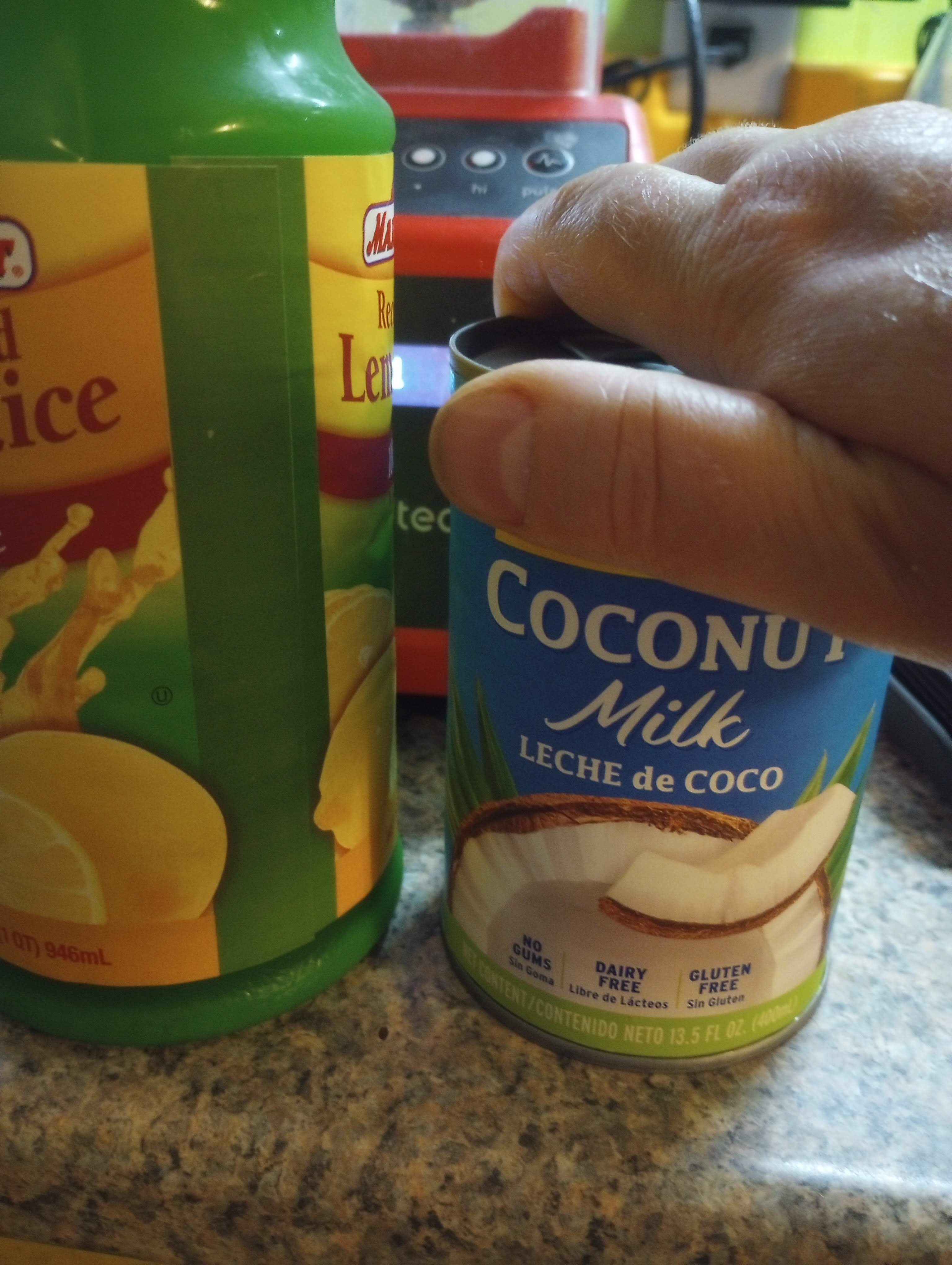 After reading bunches of recipes, it became clear that there is a fairly consistent ratio of lemon to creamy stuff to ice- 1:1:3; sweeten as desired. I cracked a can of coconut milk and got to mixing.