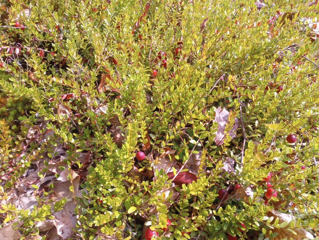 My favorite foraging grounds for cranberries are starting to recover. In the past few years, had a very dry summer which weakened the plants, then a very wet summer which flooded them. Being wildly resilient, they are now producing again. I am hoping the plants will supply my Thanksgiving Day cranberry needs next year.