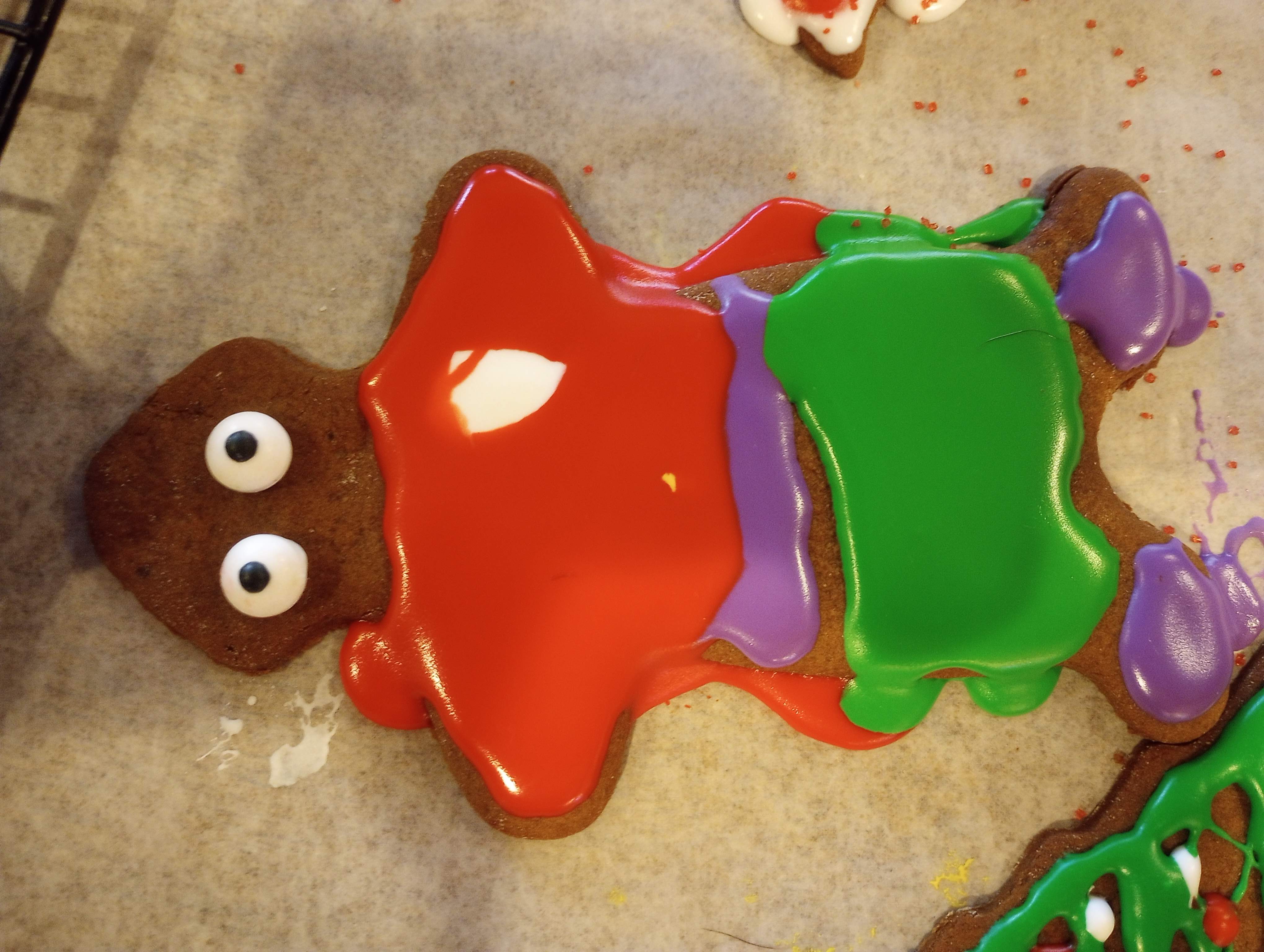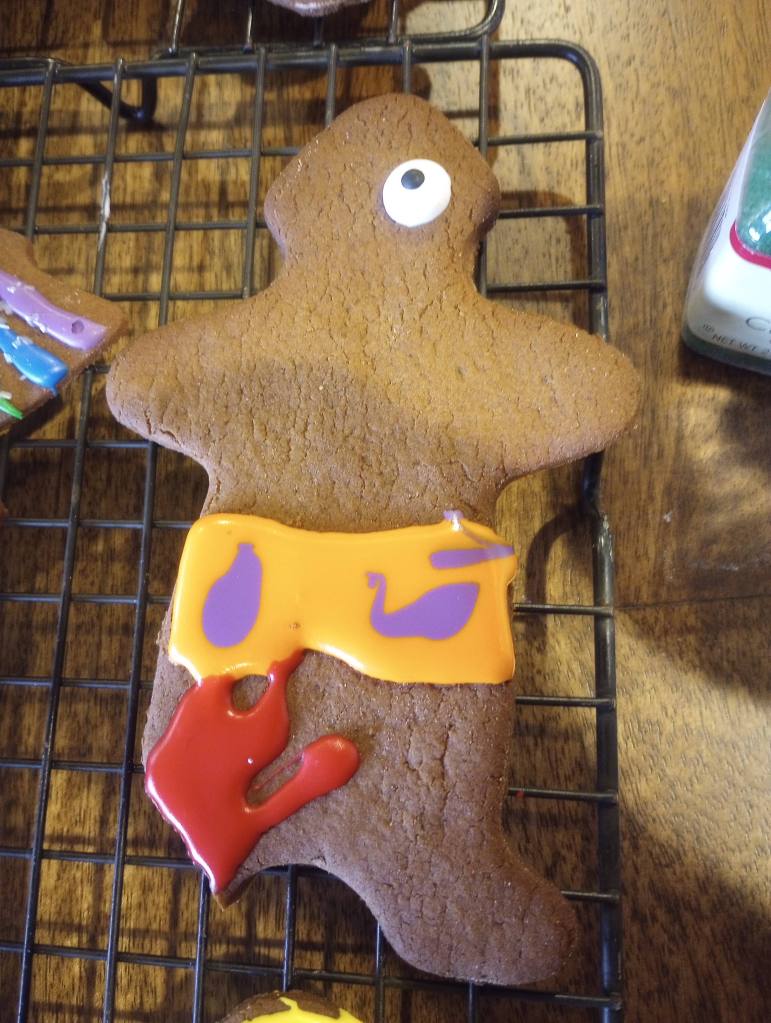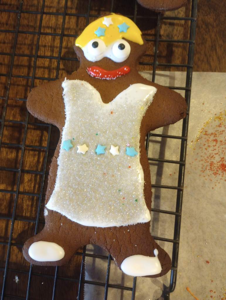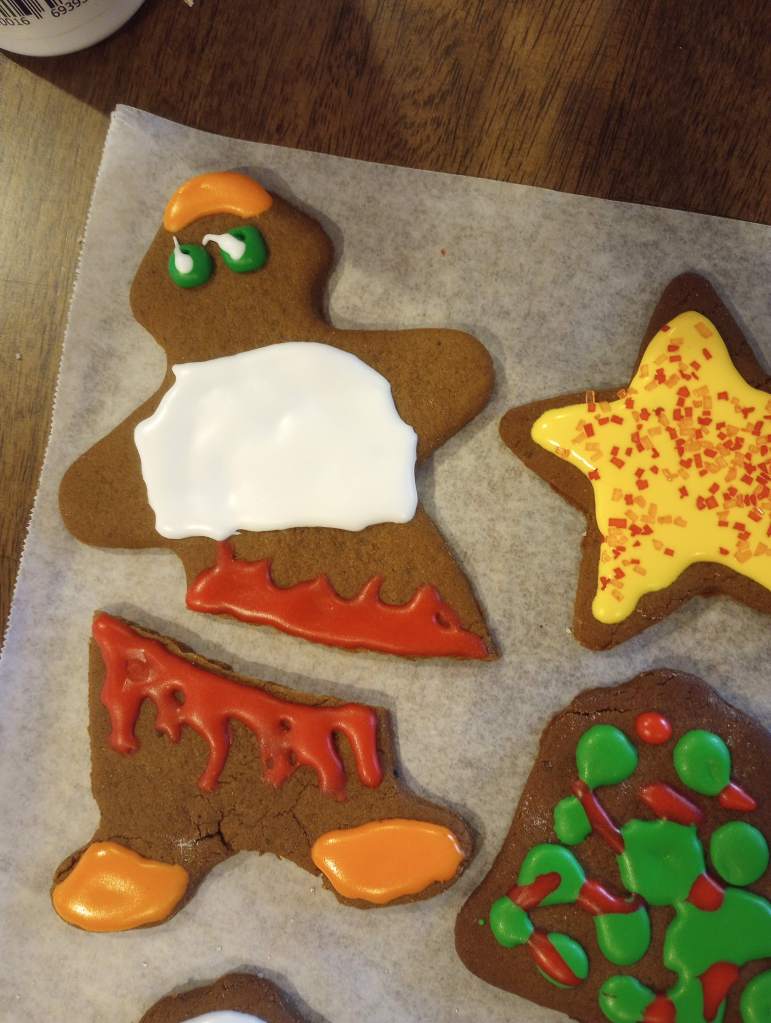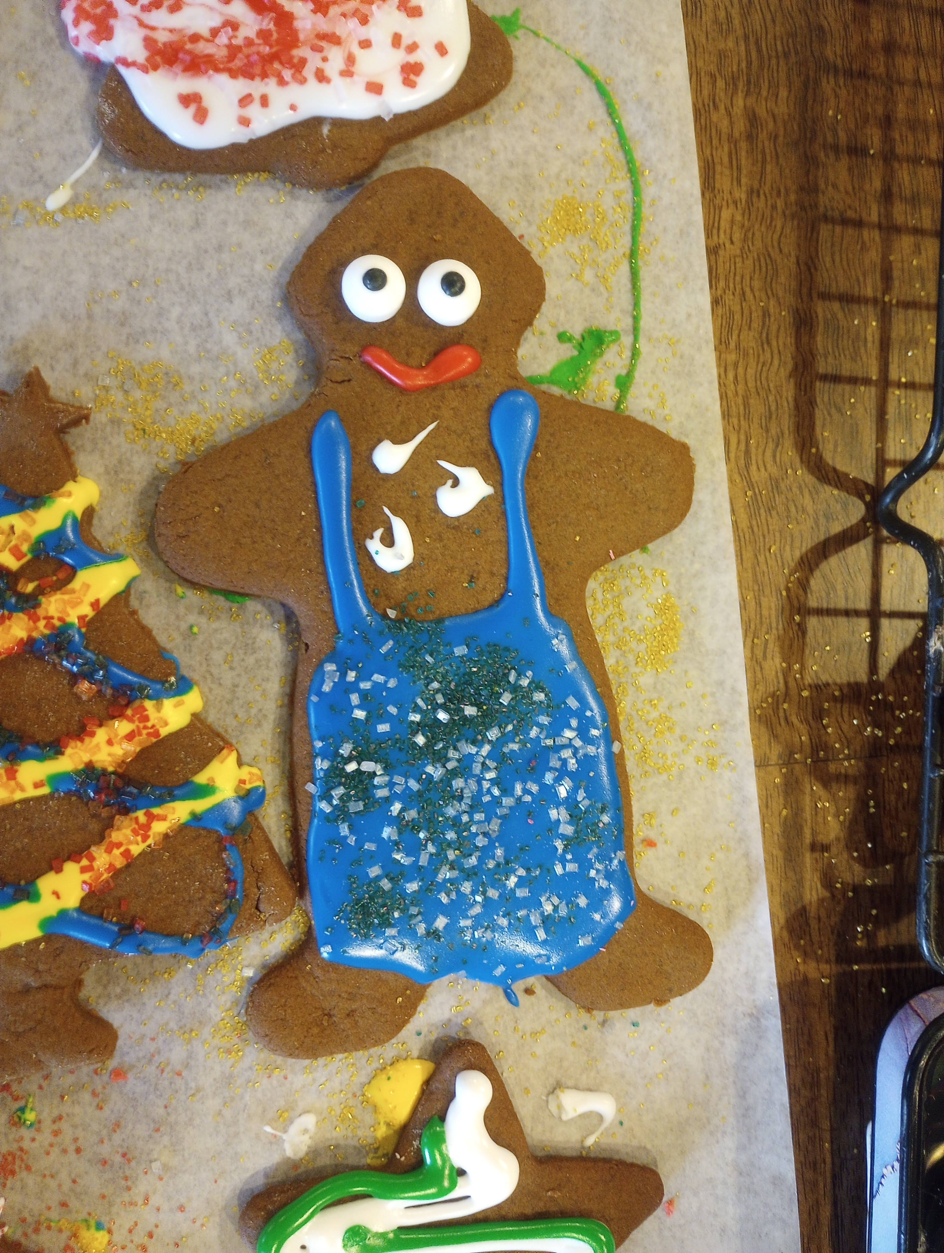 Now I am sure you are all wondering- did you make and decorate Moravian Spice Cookies? Did you name the gingerbread folk? Does Krampus smack naughty children with a birch rod? Yes, Dad and Sammy and Karen (another chosen sister) and I made some new gingerbread folk friends. Here they are, enjoy.