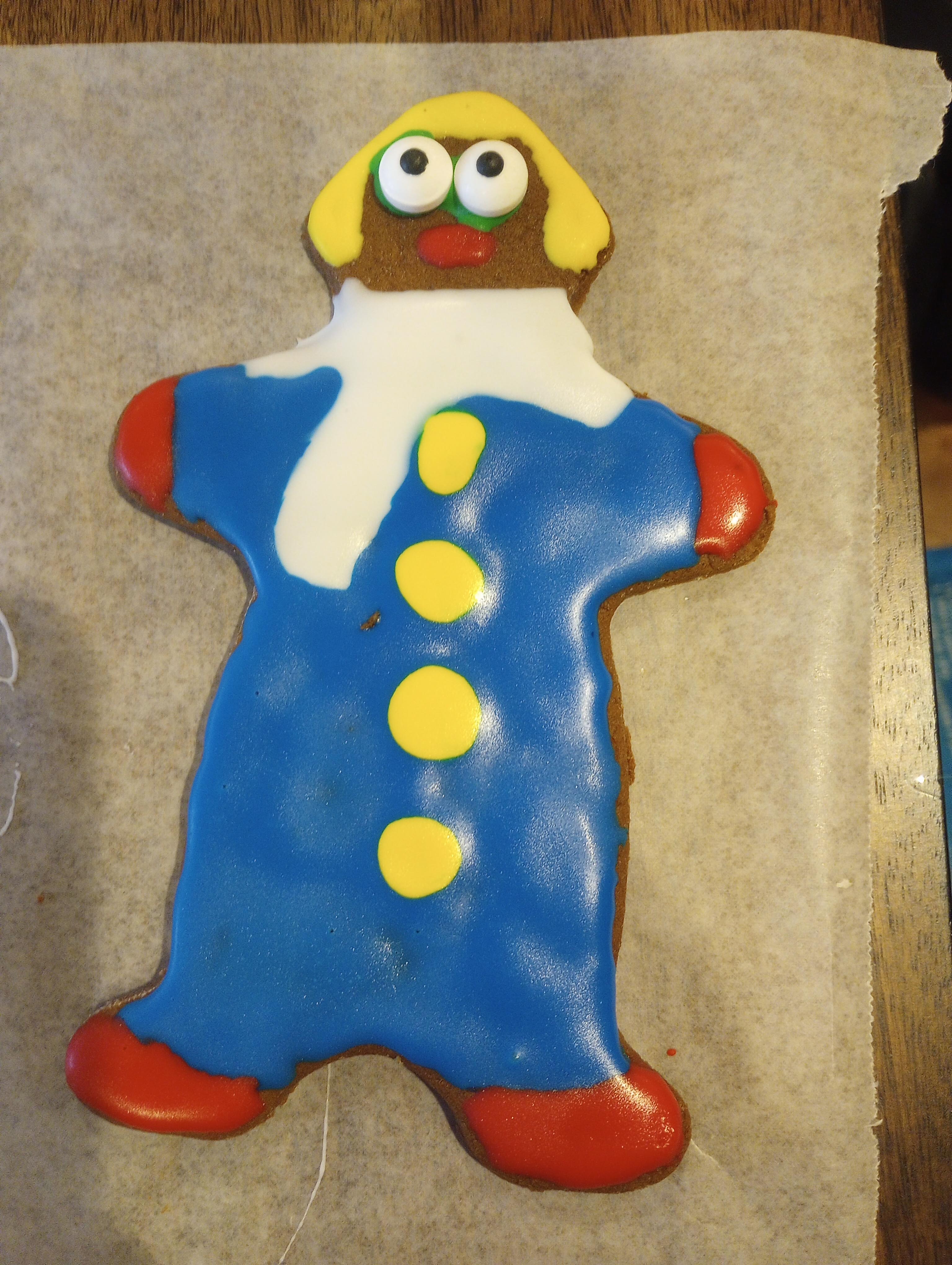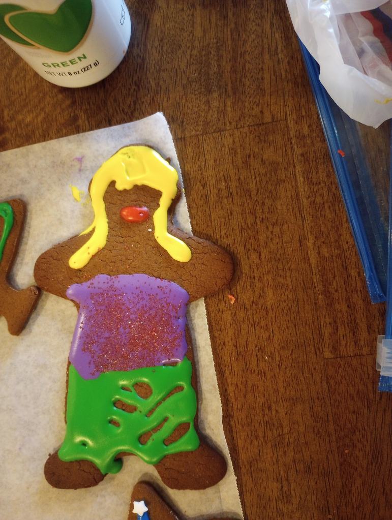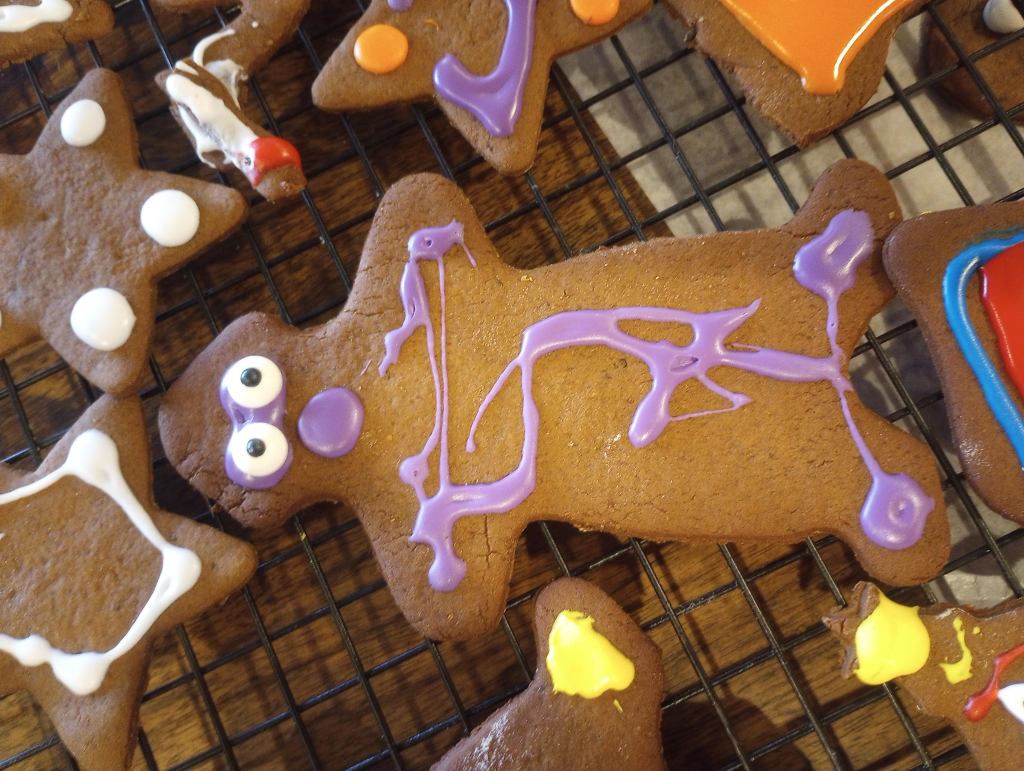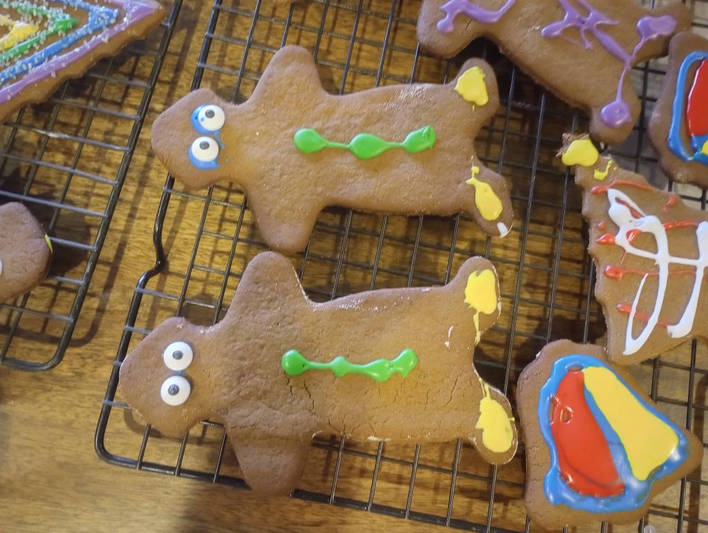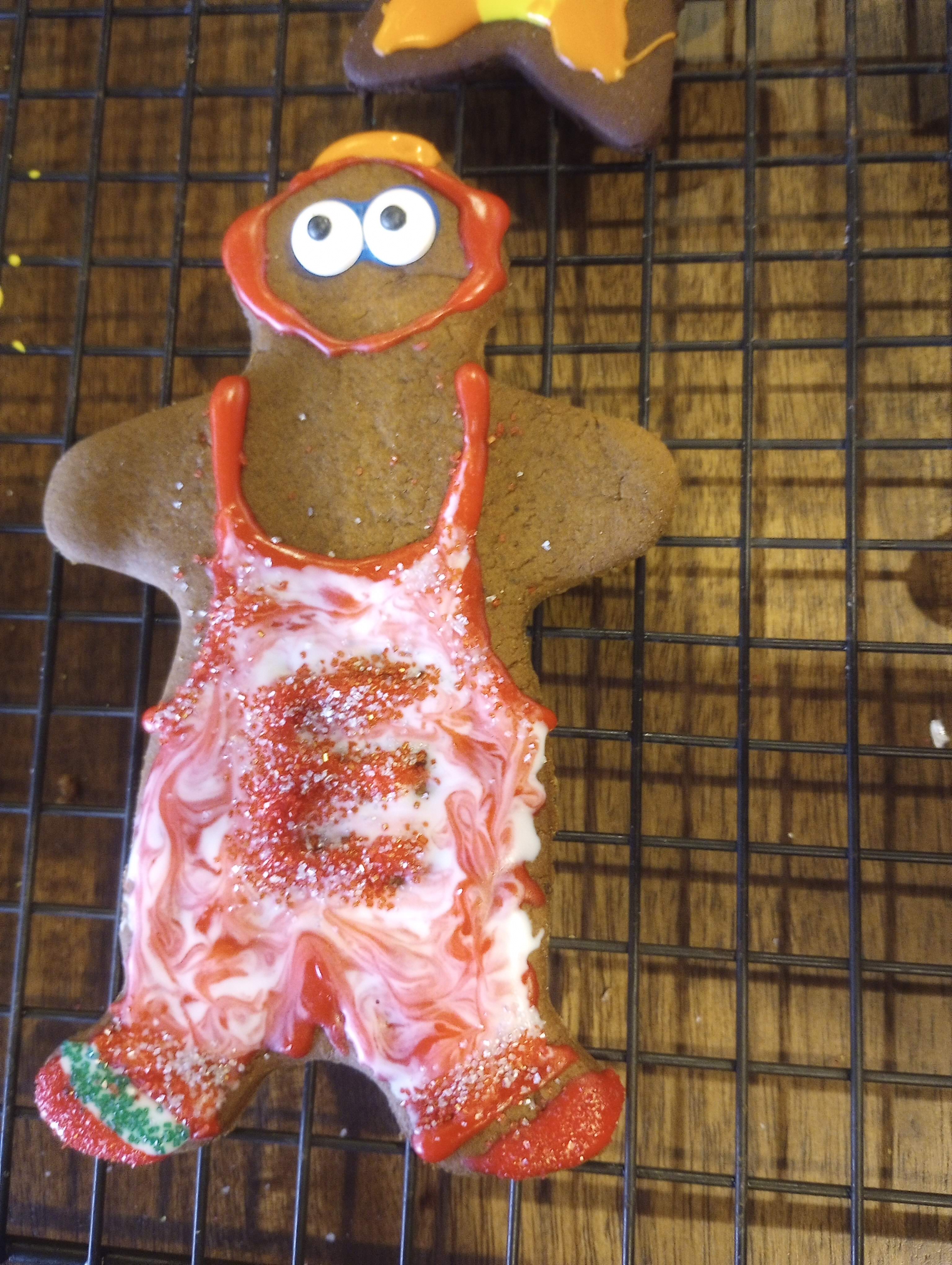 Now I am sure you are all wondering- did you make and decorate Moravian Spice Cookies? Did you name the gingerbread folk? Does Krampus smack naughty children with a birch rod? Yes, Dad and Sammy and Karen (another chosen sister) and I made some new gingerbread folk friends. Here they are, enjoy.
