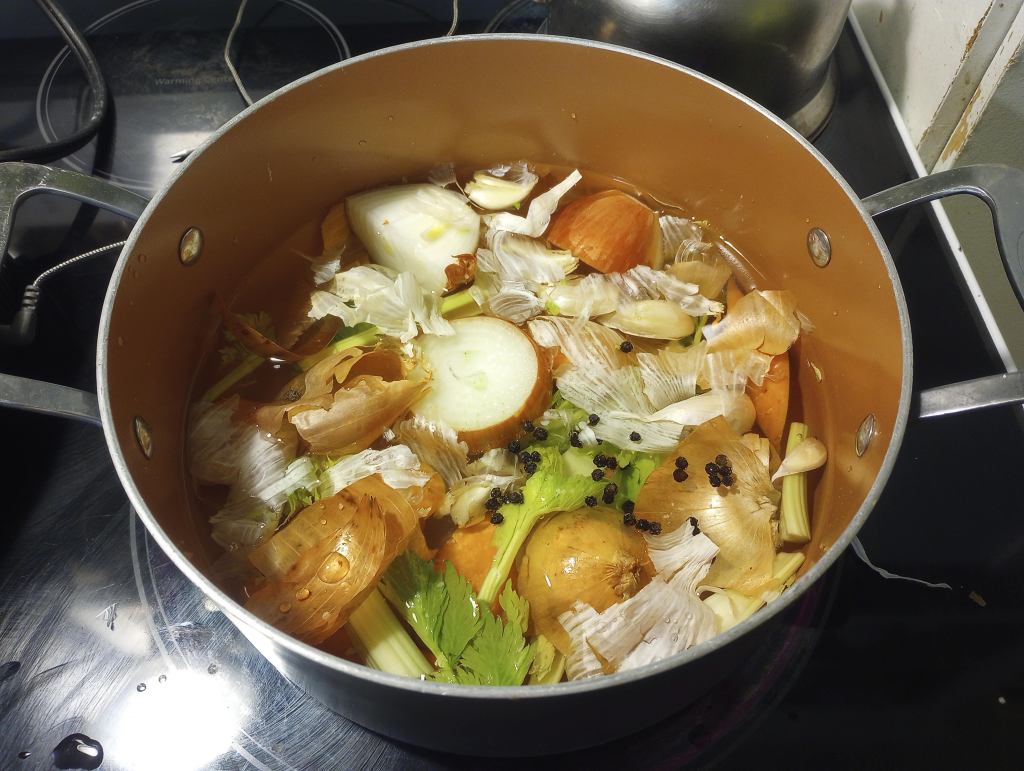 I baked 4 chicken leg quarters (the drumstick plus the thigh), then took the meat off the bones. The meat went into the refrigerator and the bones went into a pot with an onion, a few garlic cloves (okay, it was more like 6 garlic cloves) a carrot, the middle of a celery bunch and some pepper corns. I covered it all with water and let it simmer. My three top tips for making stock are as follows. 1) Do not add salt until the end. Water will evaporate and make the stock more concentrated. If you add salt too early the concentrated stock may be over salted in the end. 2) Do not bother chopping things pretty. It will all get strained out. 3) Leave the peels on the onions. The skins give the stock a lovely color.