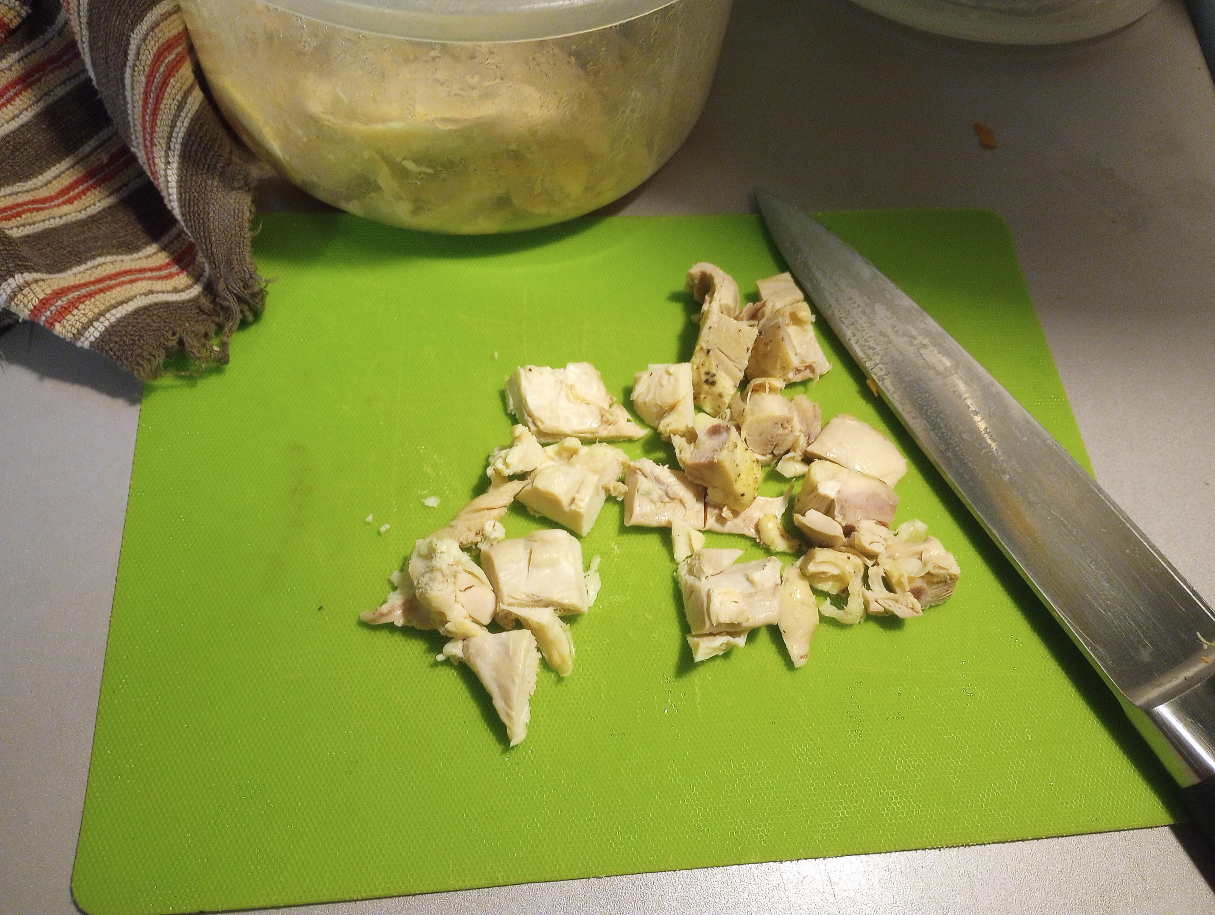 For the finished soup, you do want to cut the vegetables pretty. I also chopped some of the chicken meat to add to the soup. I know times are tough out there for many households. If you need to be extra thrifty it is perfectly acceptable to make soup with only vegetables and beans and keep the cooked chicken meat for another meal. Our foremothers would approve of this option.